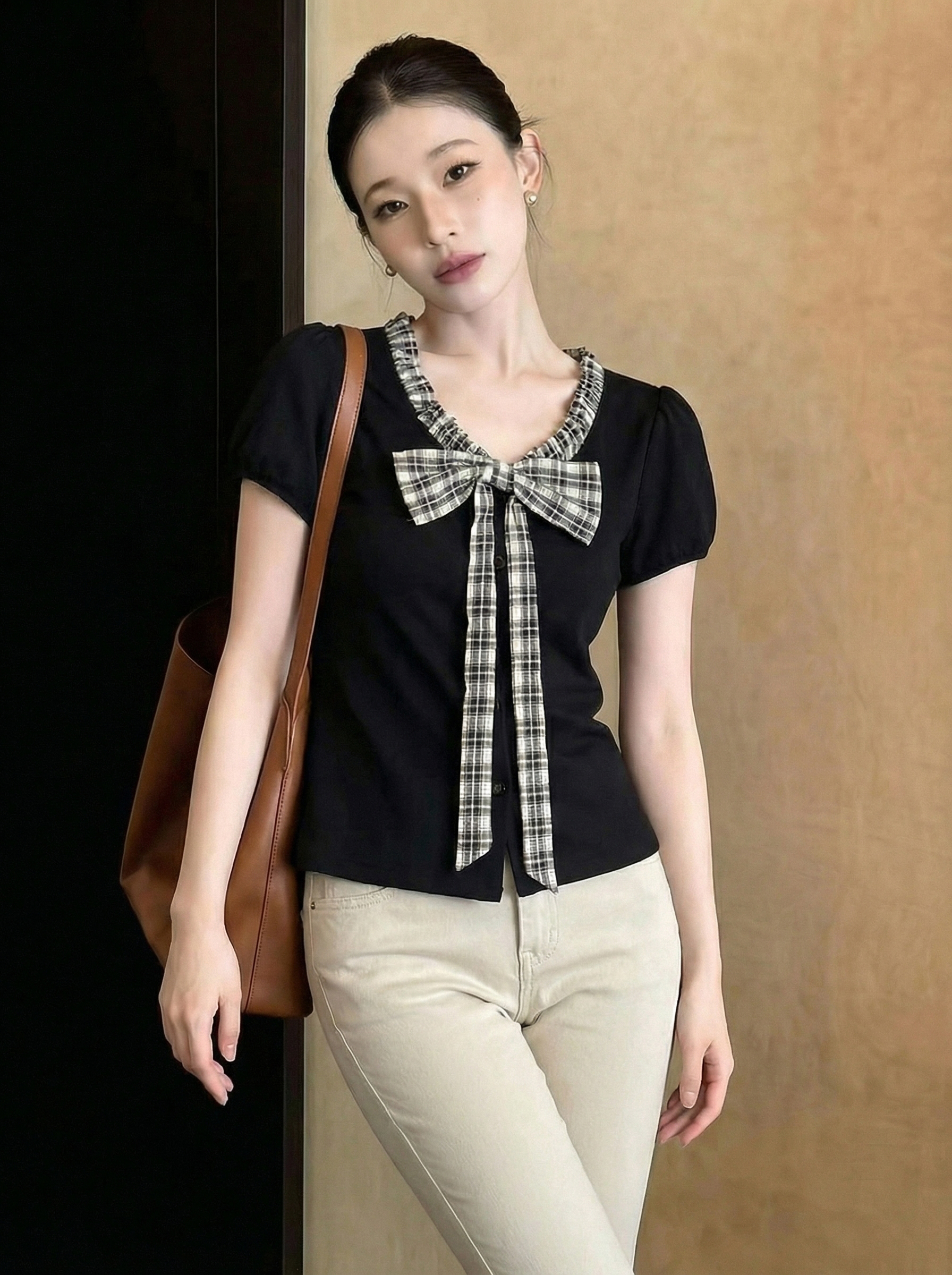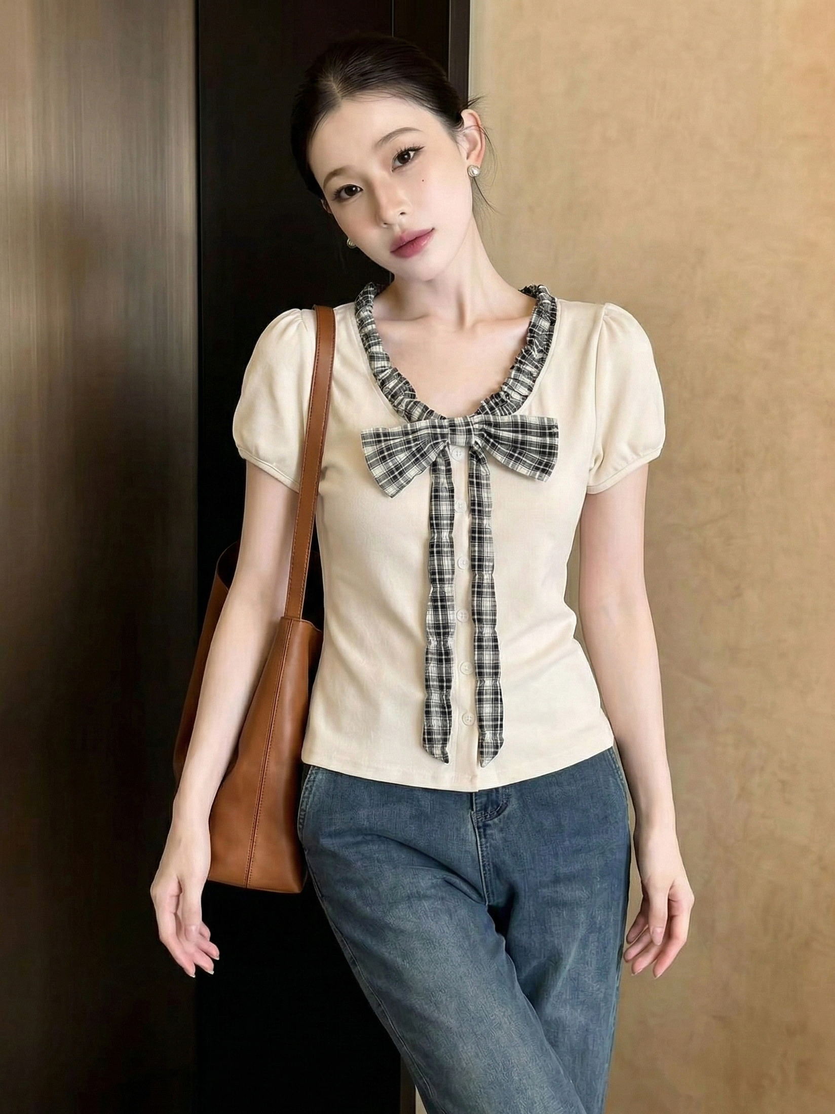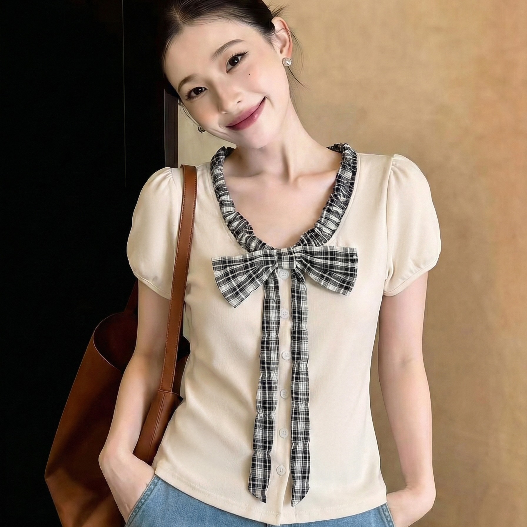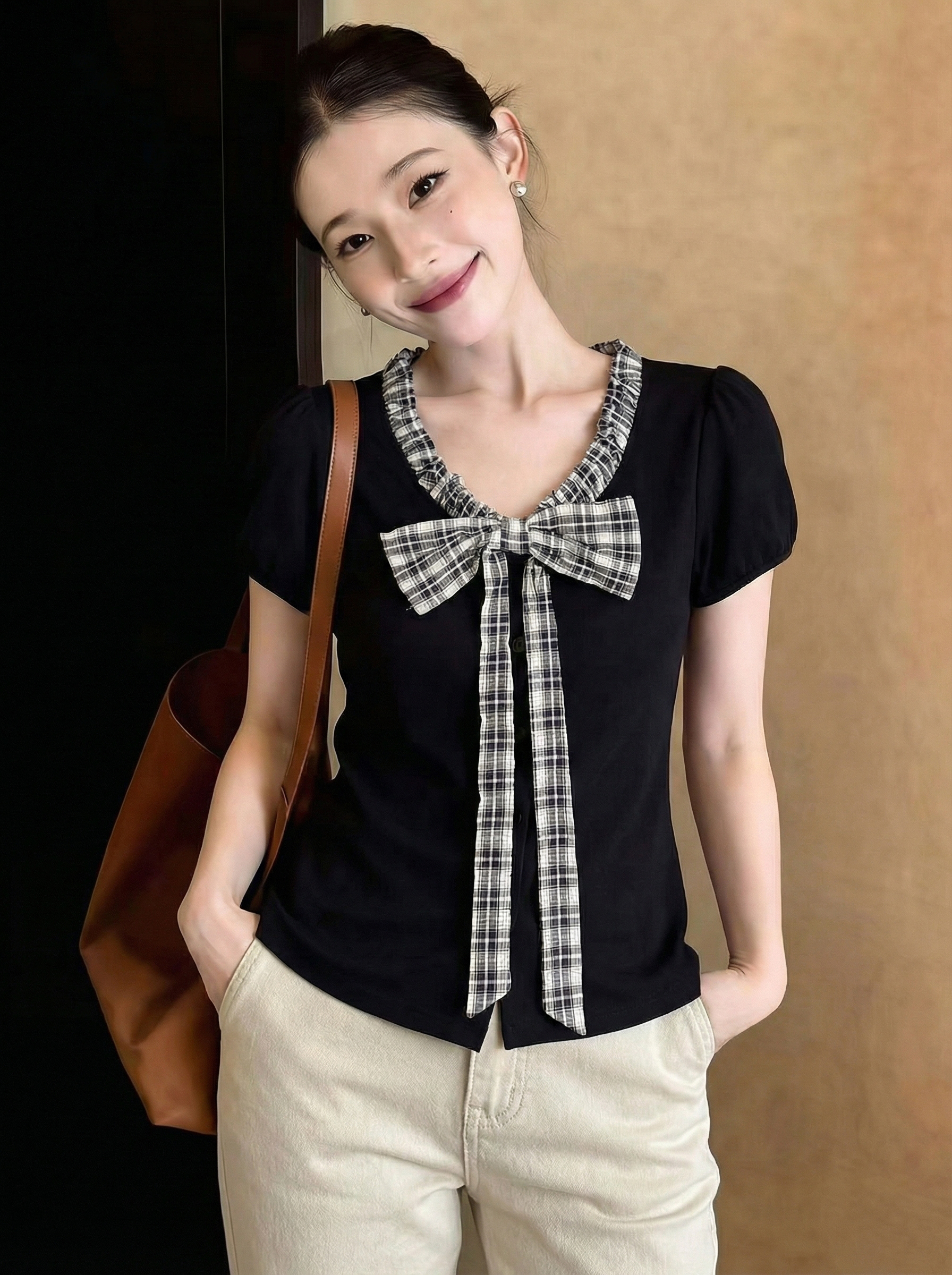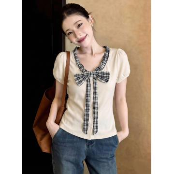 BY15042# 格纹蝴蝶结短袖T恤韩系气质温柔休闲百搭甜美减龄上衣女 服裝批發女裝批發服飾貨源