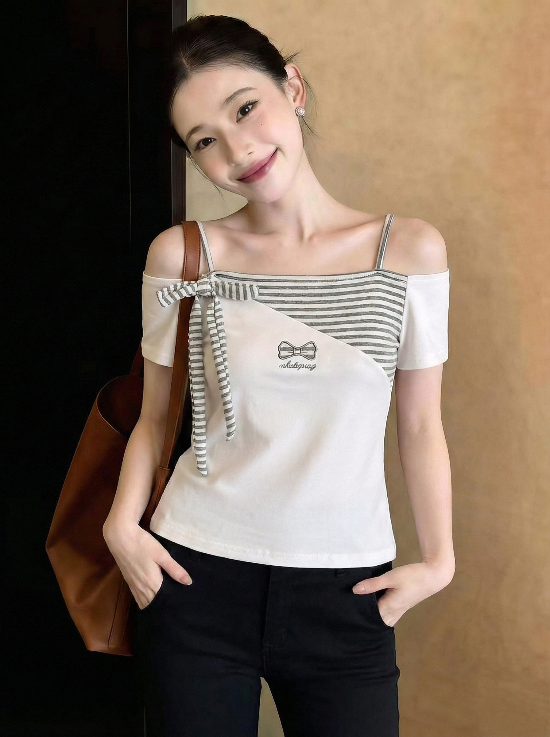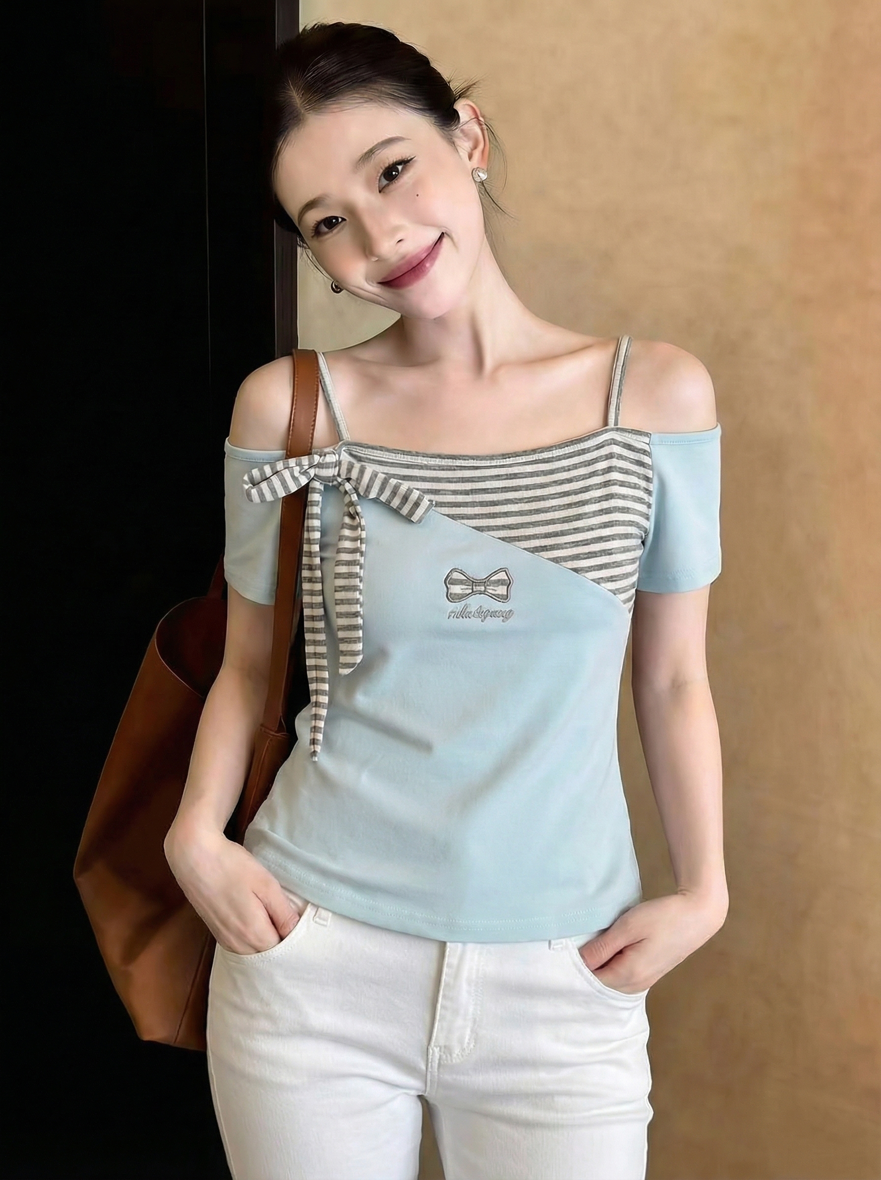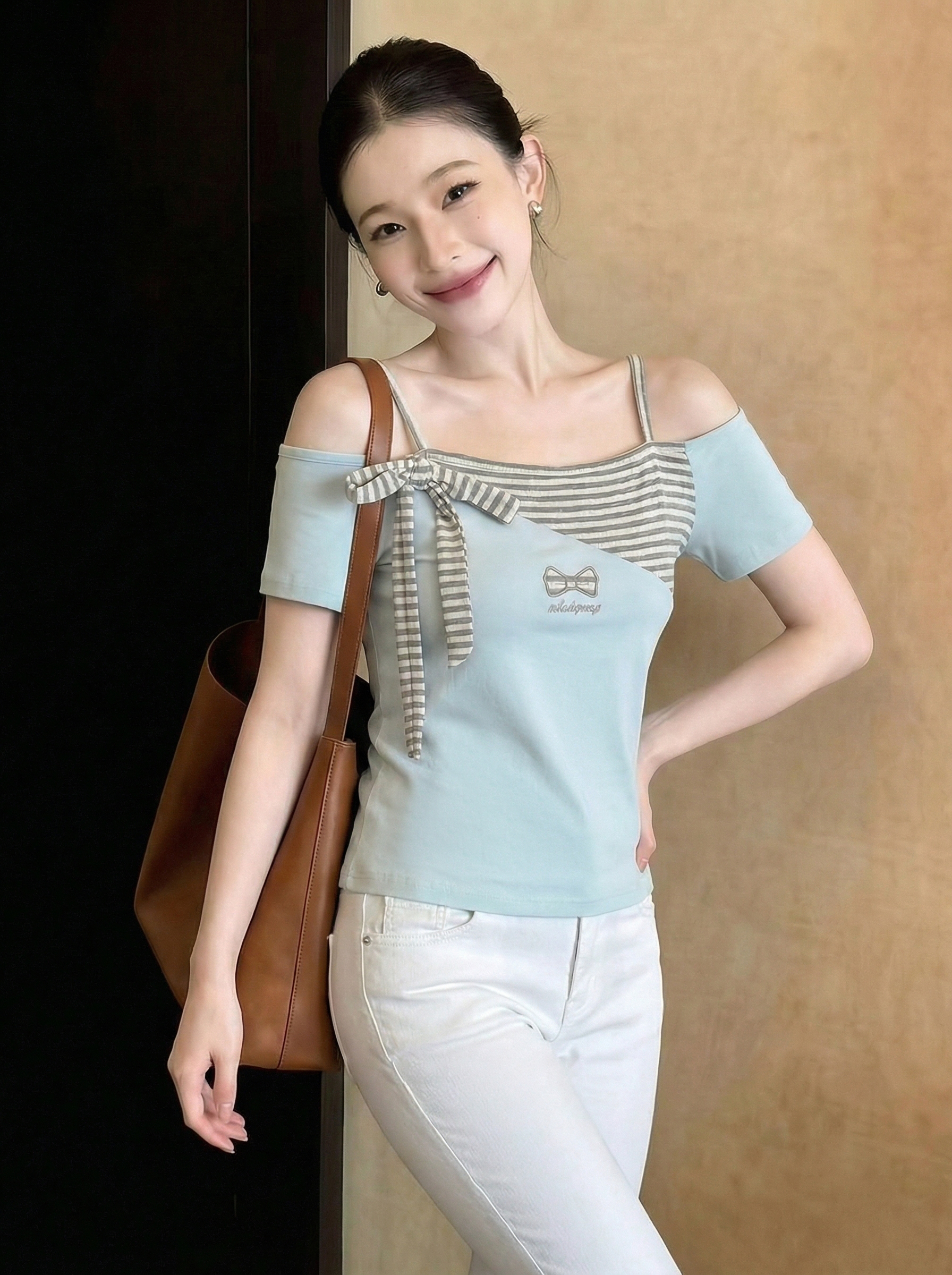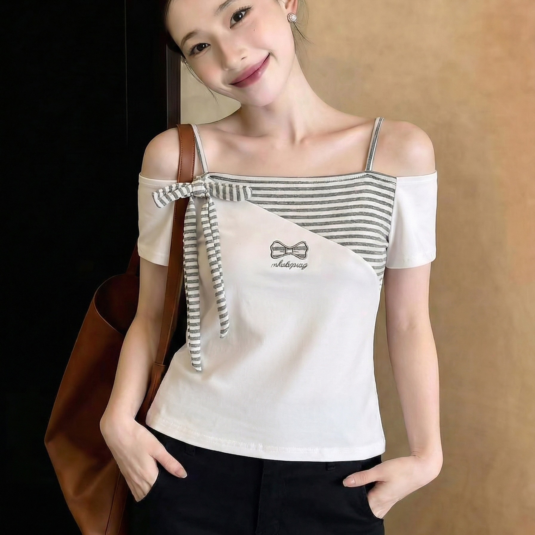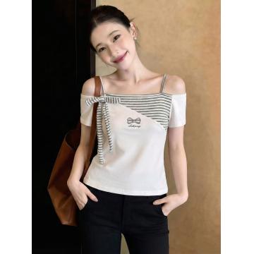 BY15043# 夏季修身显瘦小个子条纹刺绣拼接撞色短袖T恤女上衣 服裝批發女裝批發服飾貨源