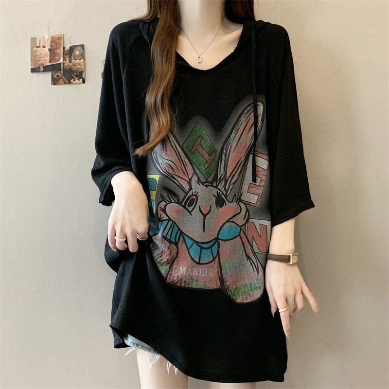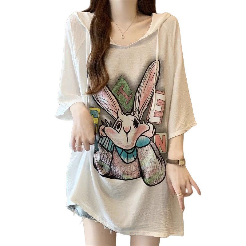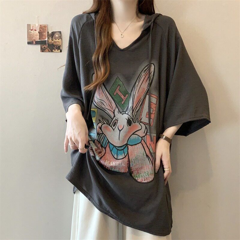 BY15046# 冰丝邹夏季新款宽松卡通印花短袖连帽T恤上衣 服裝批發女裝批發服飾貨源