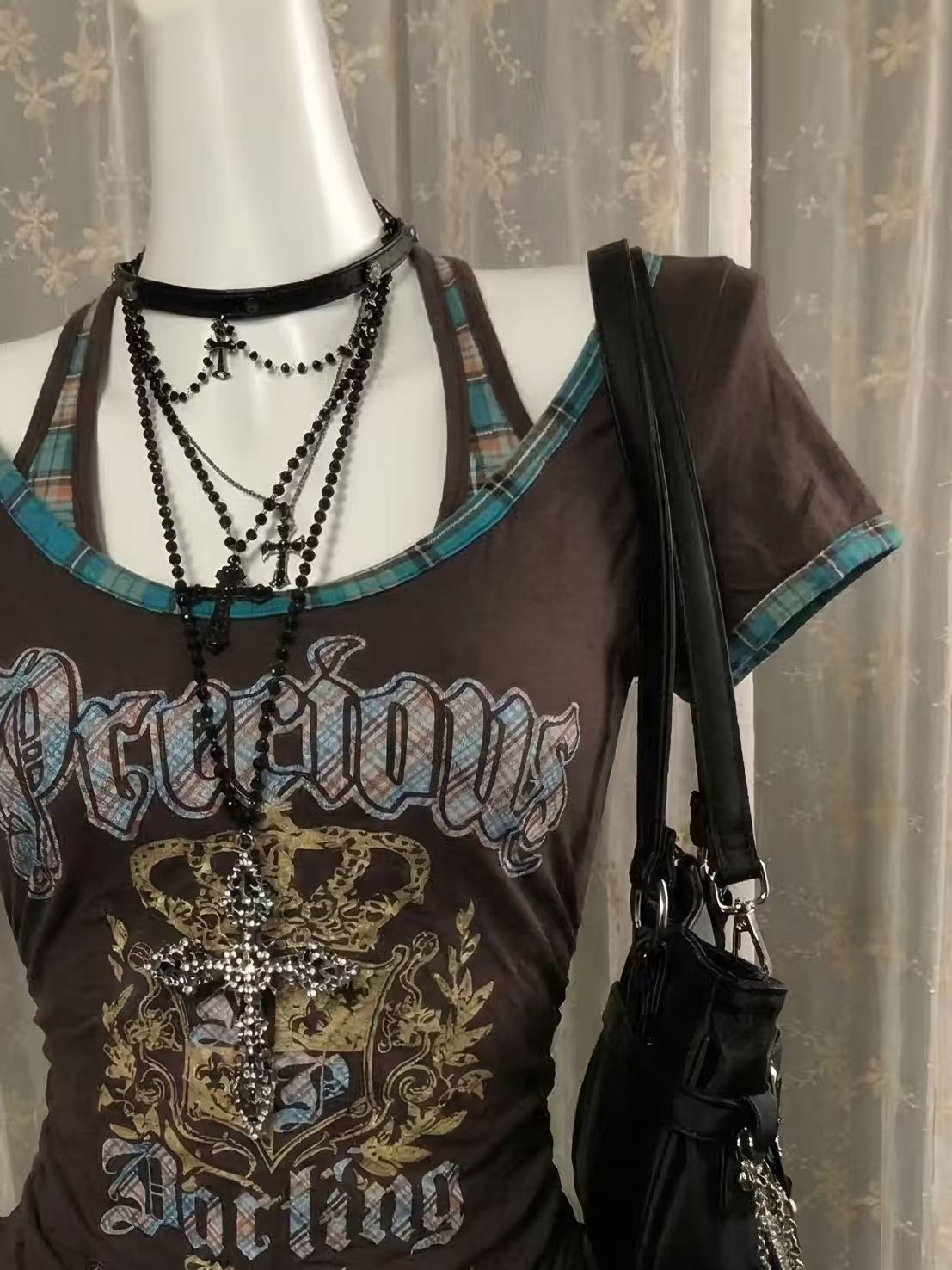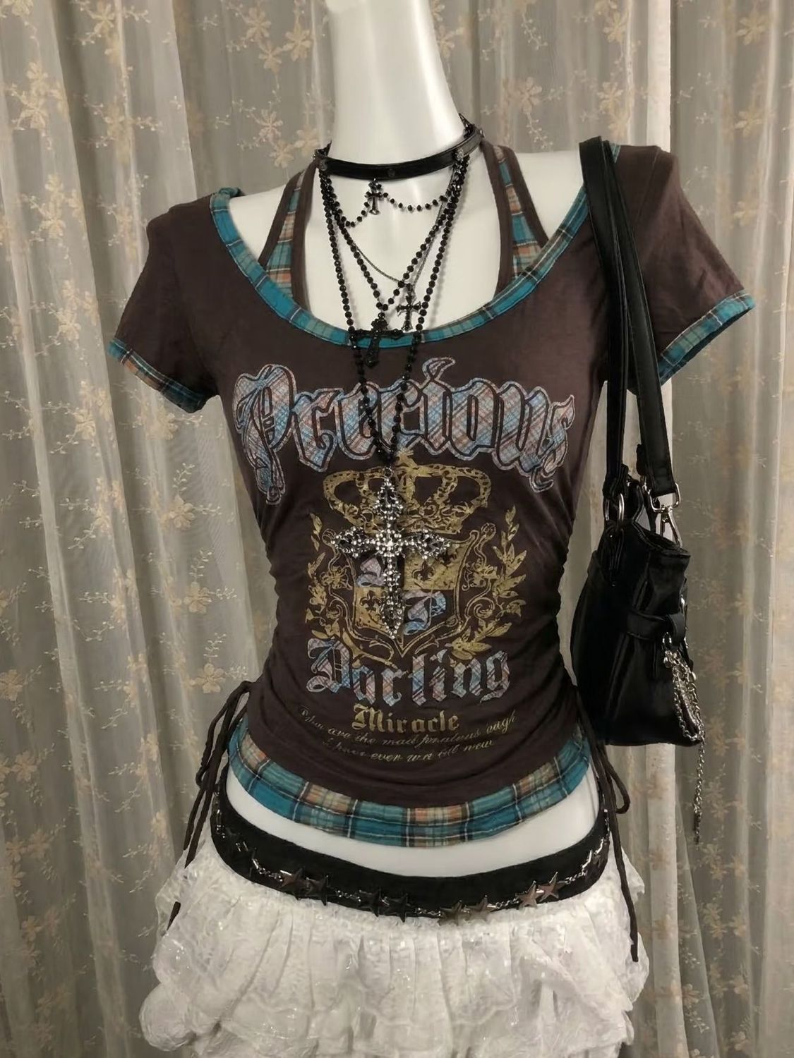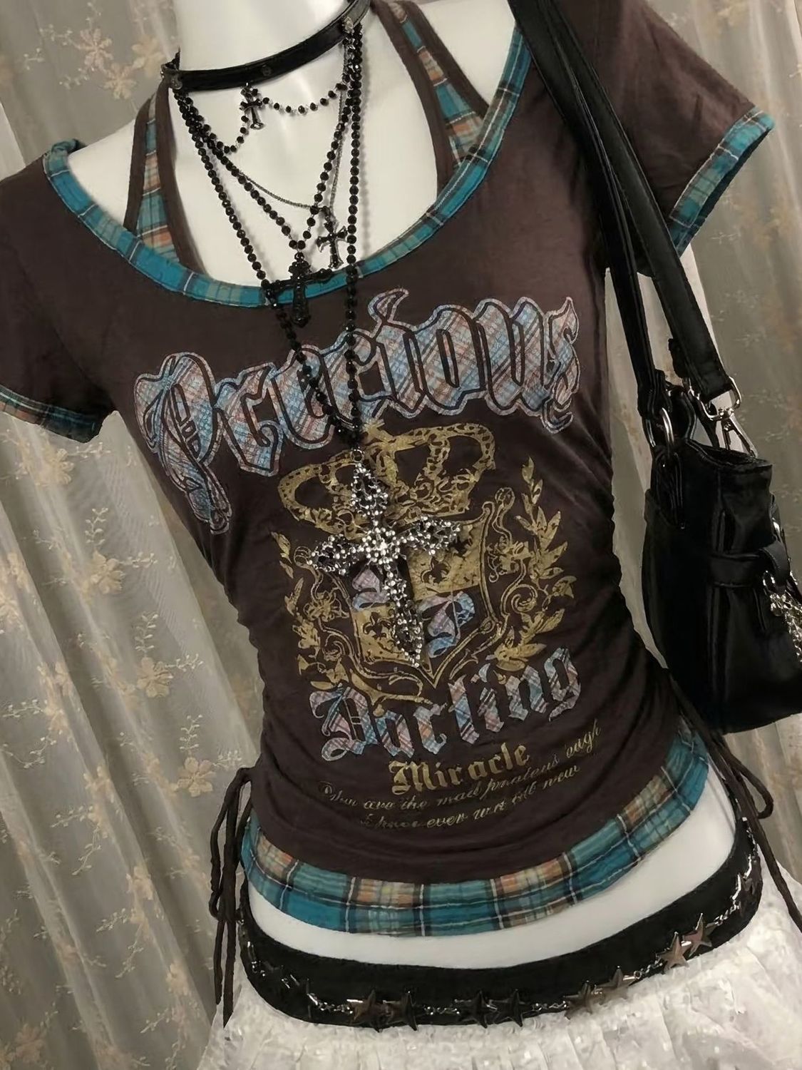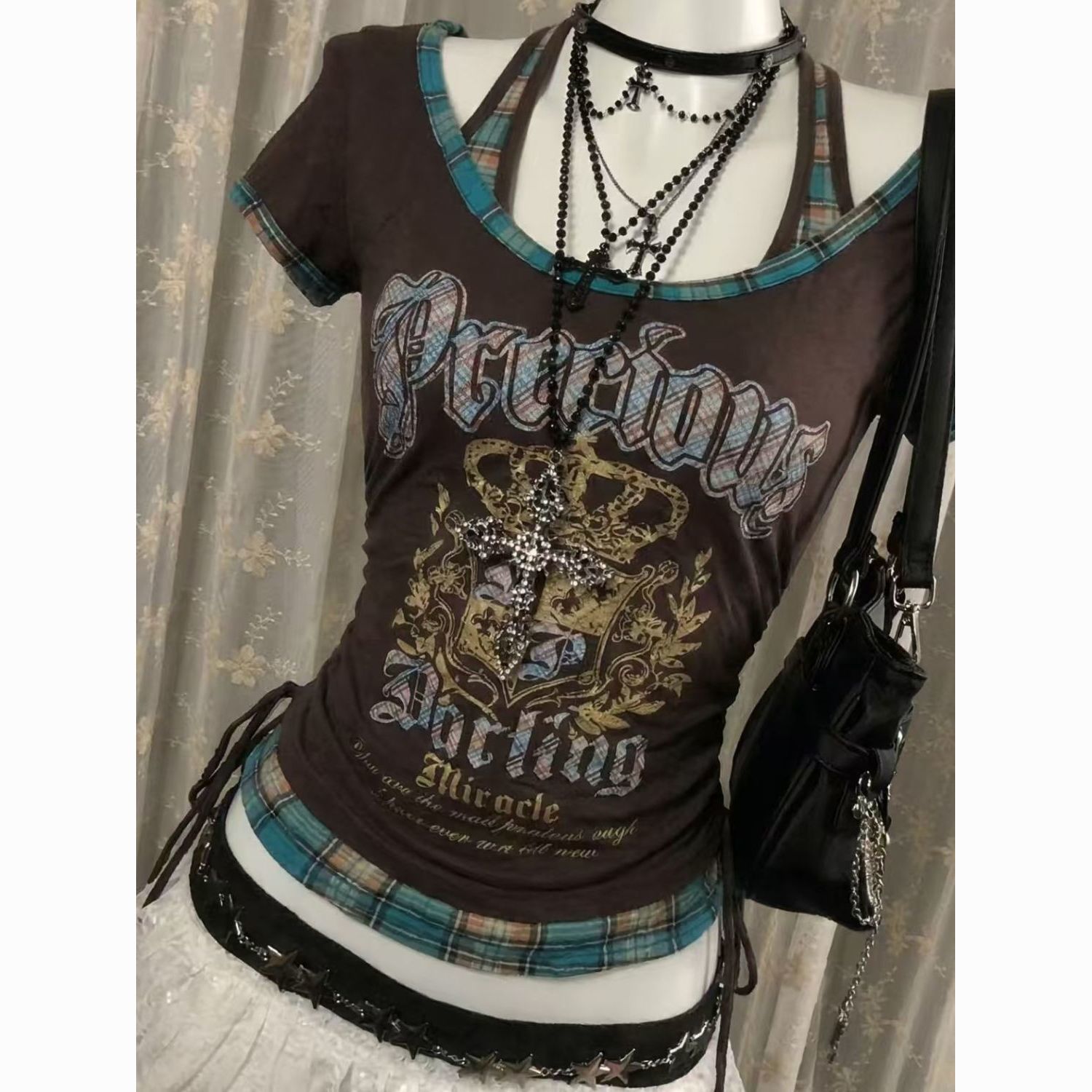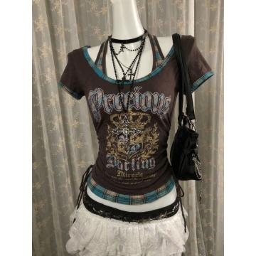 BY15051# 美式复古印花挂脖假两件拼接短袖T恤显瘦百搭格子抽绳上衣 服裝批發女裝批發服飾貨源