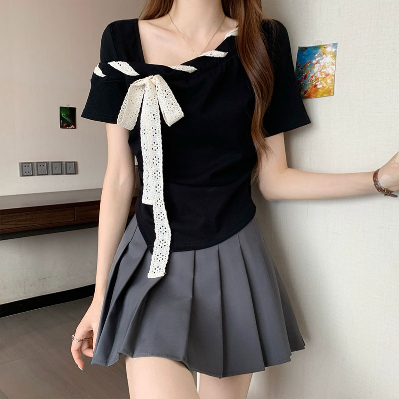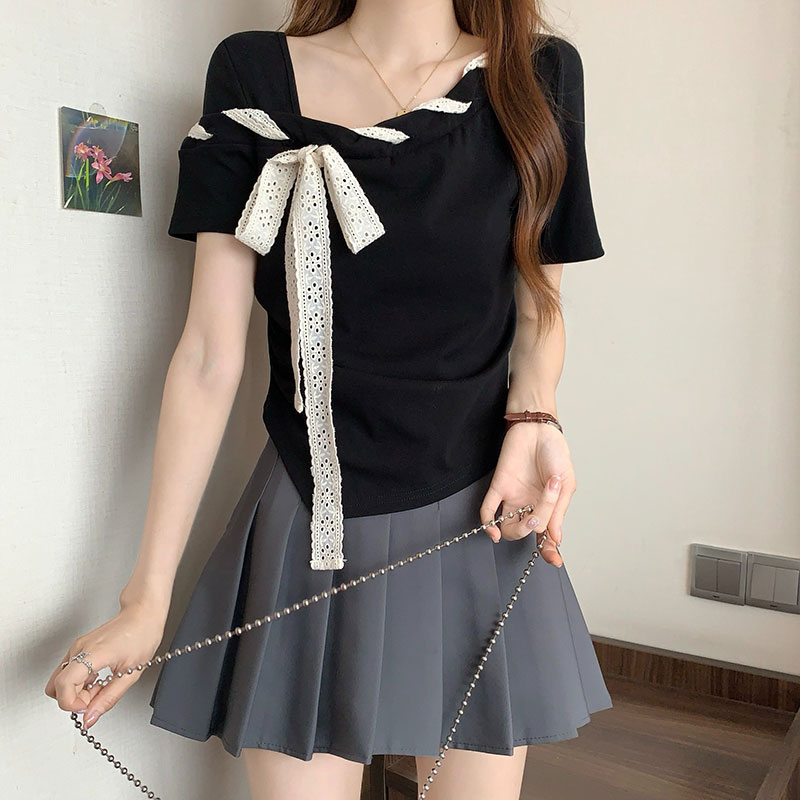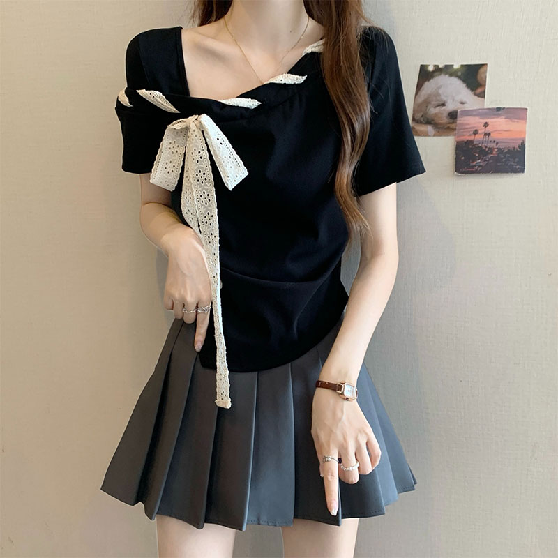 BY15060# 设计感斜肩黑色短袖T恤夏季气质蝴蝶结修身小众上衣 服裝批發女裝批發服飾貨源
