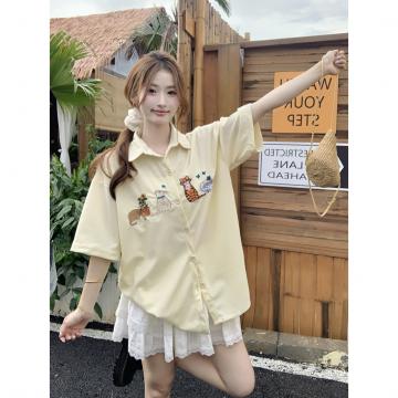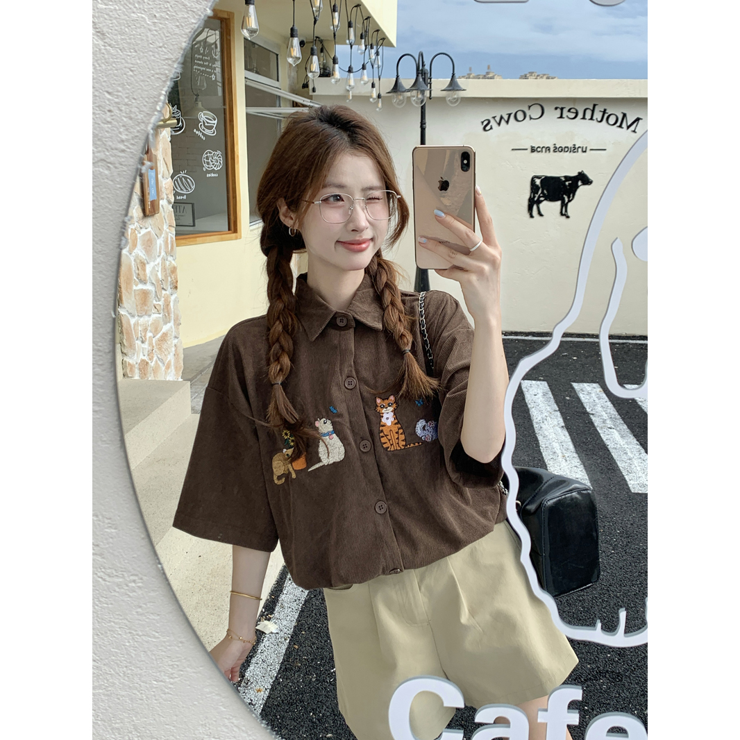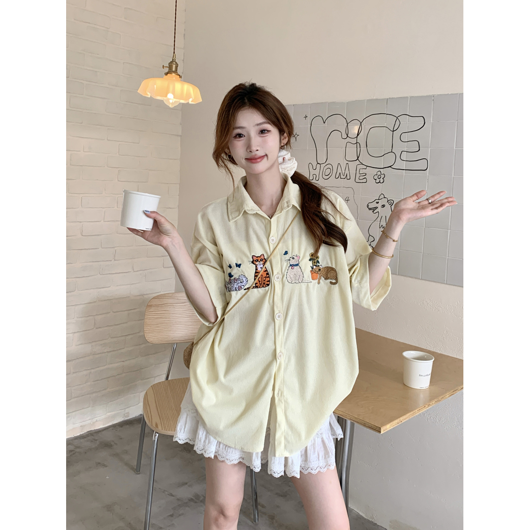 BY15061# 美式复古趣味猫咪刺绣衬衫女夏季新款百搭情侣休闲五分袖上衣 服裝批發女裝批發服飾貨源