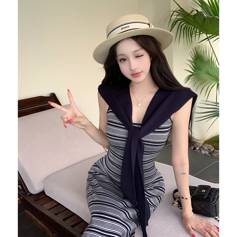BY15069# 夏季新款韩版修身显瘦条纹无袖吊带连衣裙+披肩时尚两件套潮 服裝批發女裝批發服飾貨源
