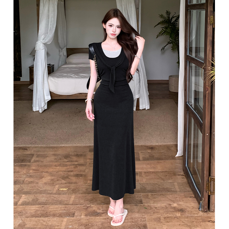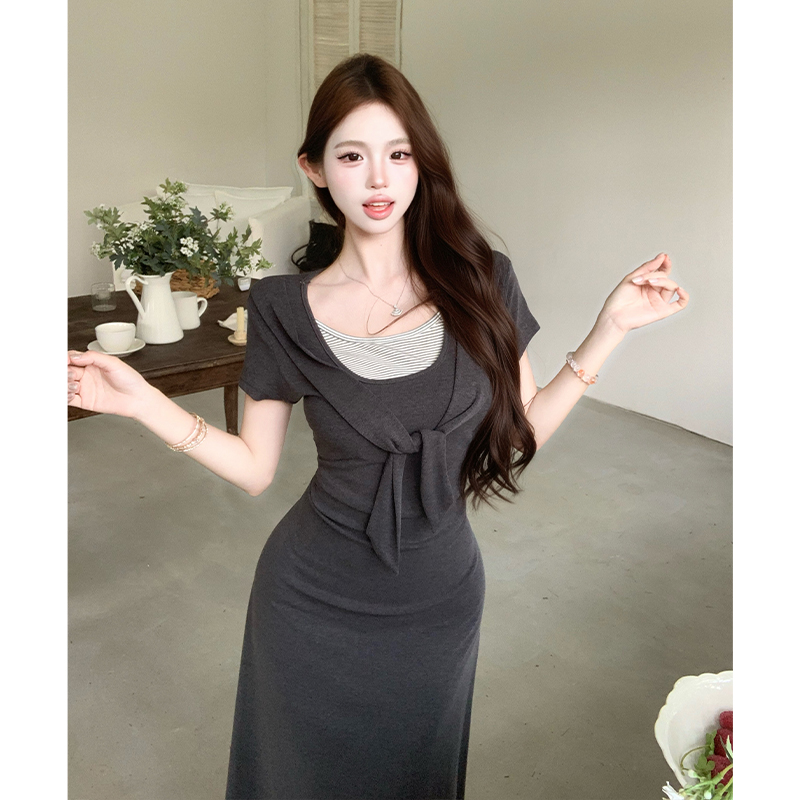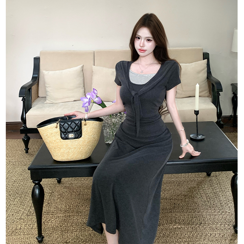 BY15074# 法式韩系假两件条纹短袖连衣裙女夏季新款设计感撞色拼接收腰长裙 服裝批發女裝批發服飾貨源