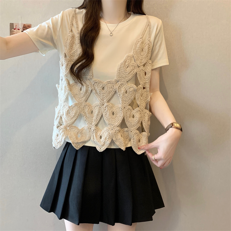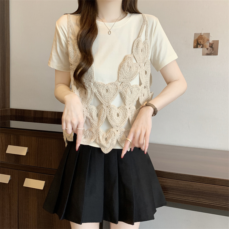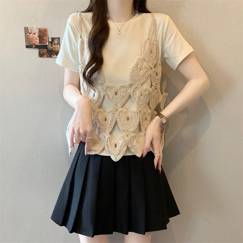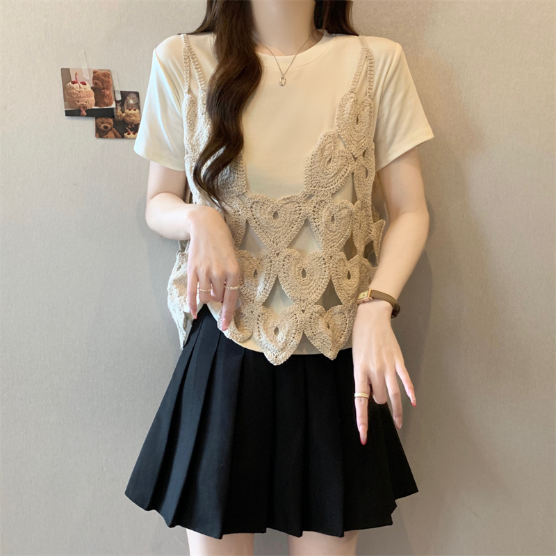 BY15076# 大码胖MM新款设计感简约爱心吊带+短袖T两件套遮肉显瘦上衣 服裝批發女裝批發服飾貨源