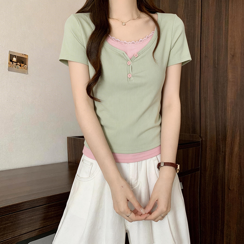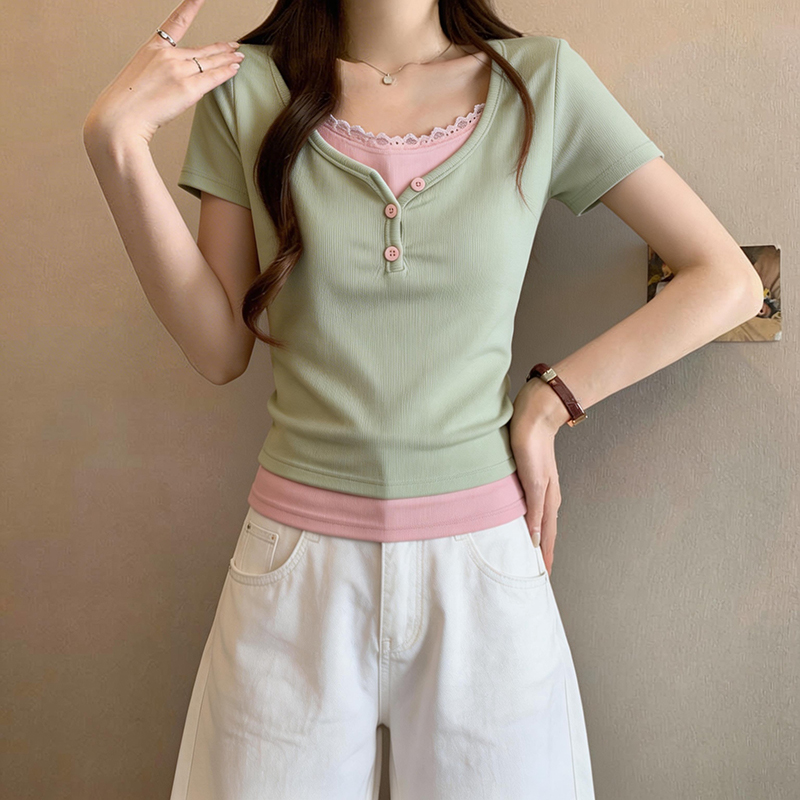 BY15081# 大码胖mm假两件t恤女夏季设计感上衣M-4XL 服裝批發女裝批發服飾貨源