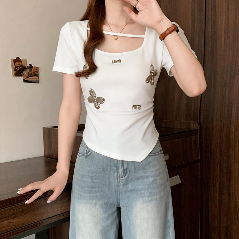 BY15082# 大码胖mm短袖T恤方领设计感炸街甜辣上衣M-4XL 服裝批發女裝批發服飾貨源