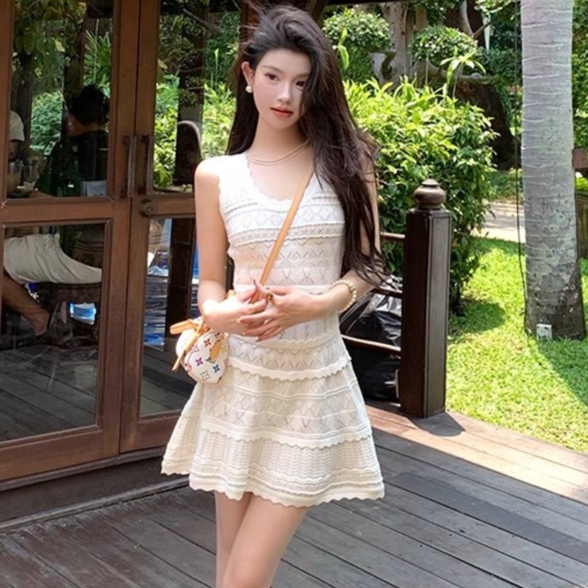 BY15107# 韩版新款奶油呼吸纯欲风白色镂空针织背心收腰连衣裙女 服裝批發女裝批發服飾貨源