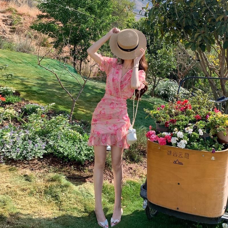 BY15109# 碎花雪纺连衣裙女夏新款设计感小众修身显瘦气质包臀鱼尾短裙 服裝批發女裝批發服飾貨源
