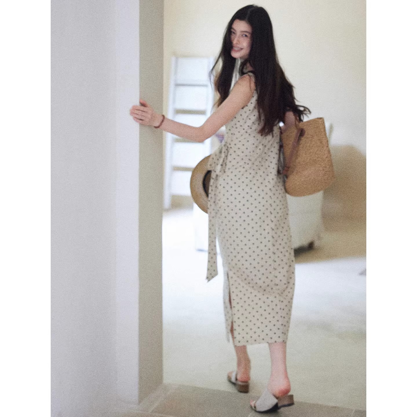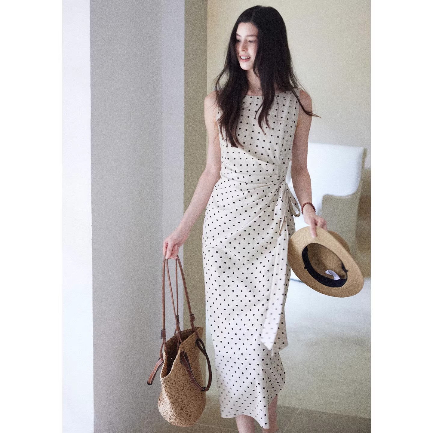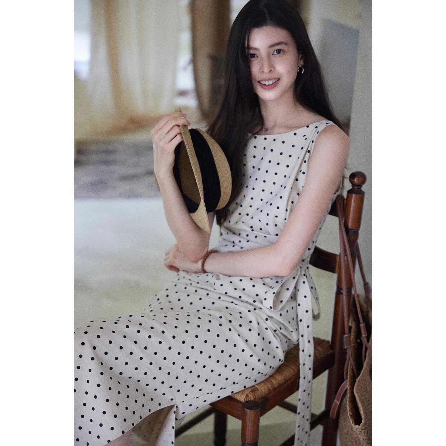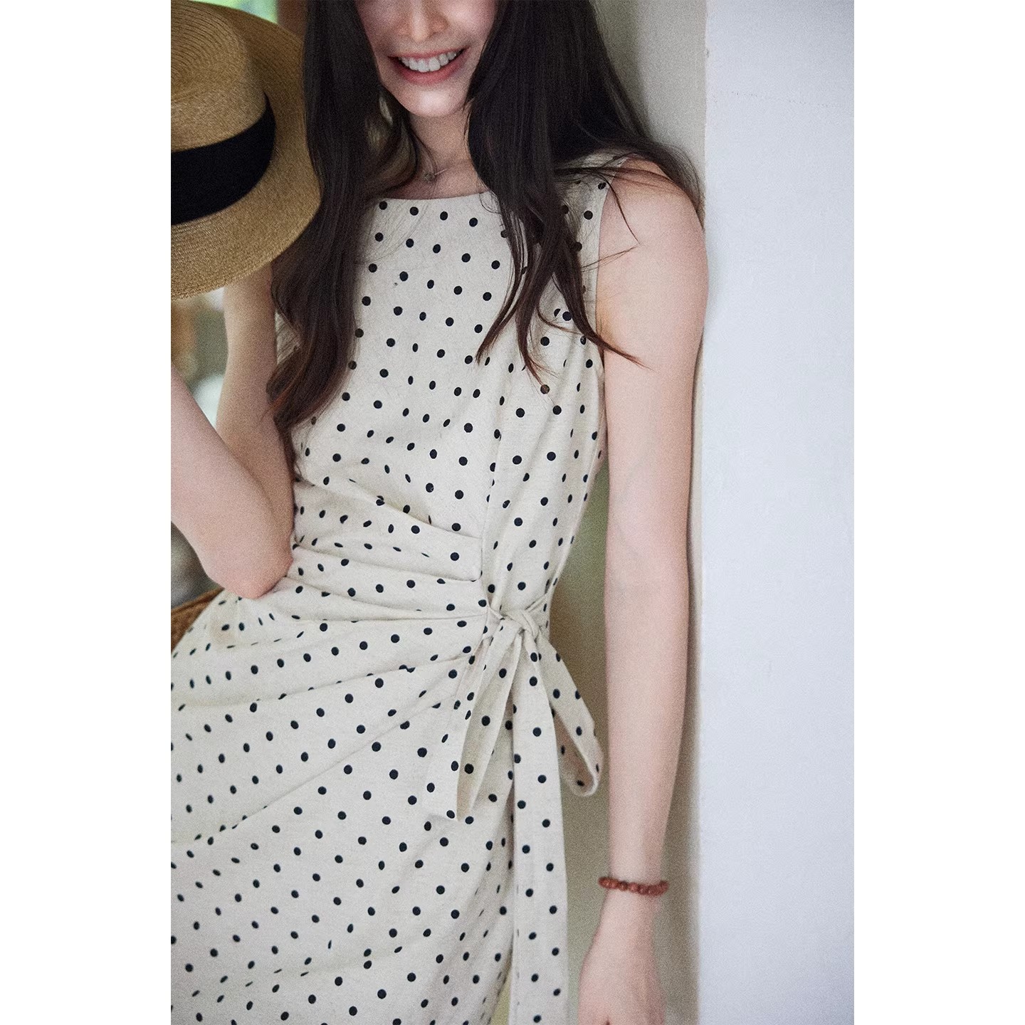 BY15184# 松间月高级感气质波点连衣裙女侧收腰亚麻棉法式长裙服裝批發女裝批發服飾貨源