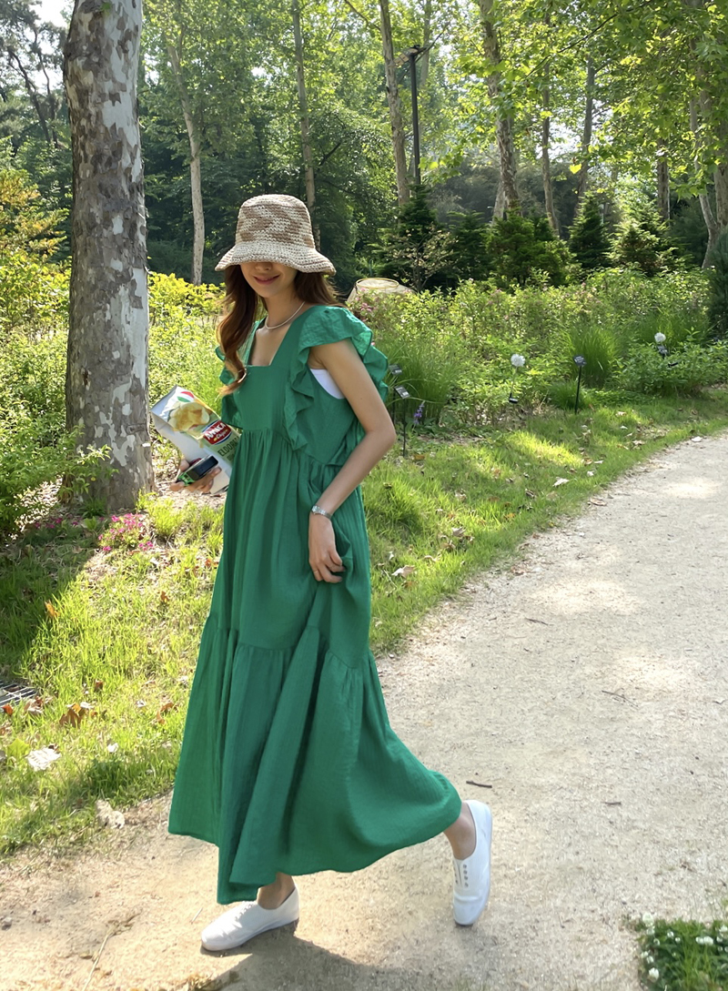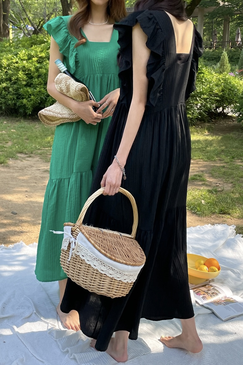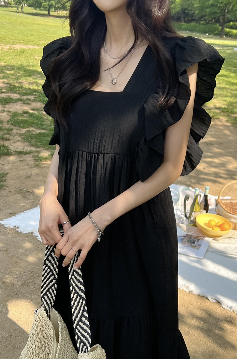 BY15213# 韩国chic方领露锁骨拼接荷叶边飞飞袖连衣裙长裙服裝批發女裝批發服飾貨源