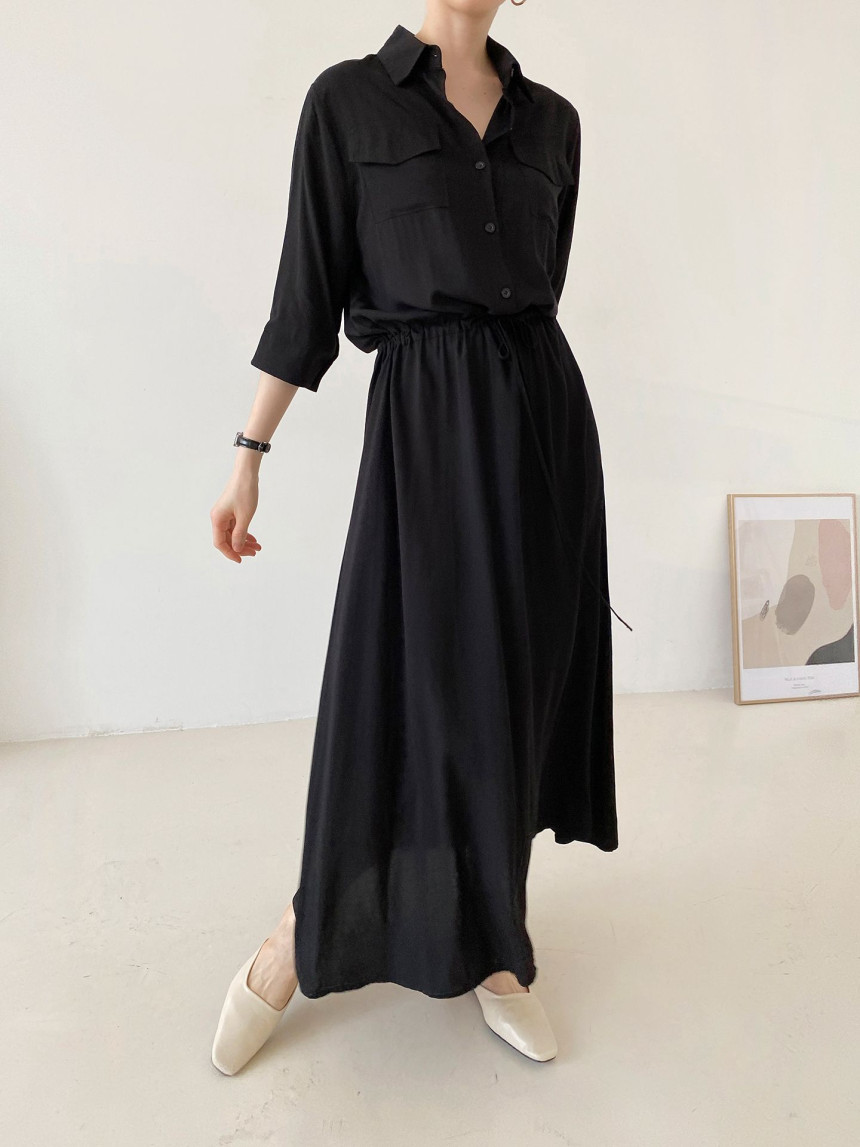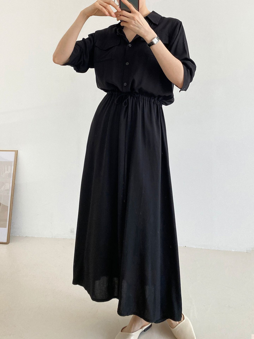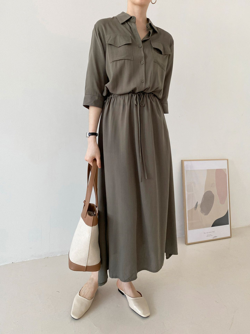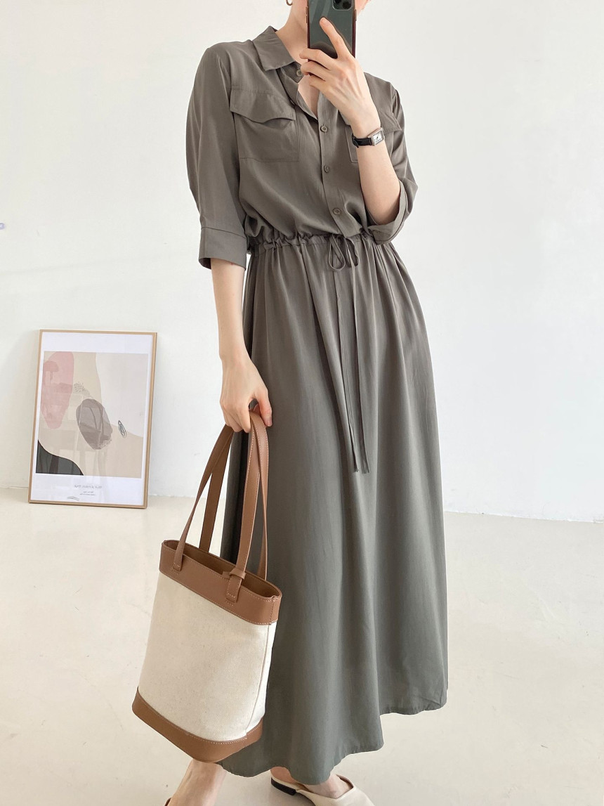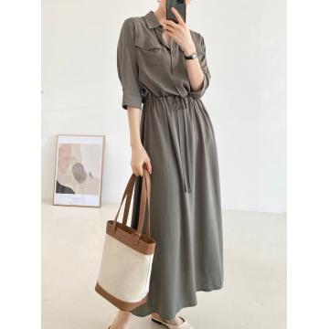 BY15215# 韩国chic法式休闲口袋宽松抽绳系带收腰连衣裙长裙服裝批發女裝批發服飾貨源