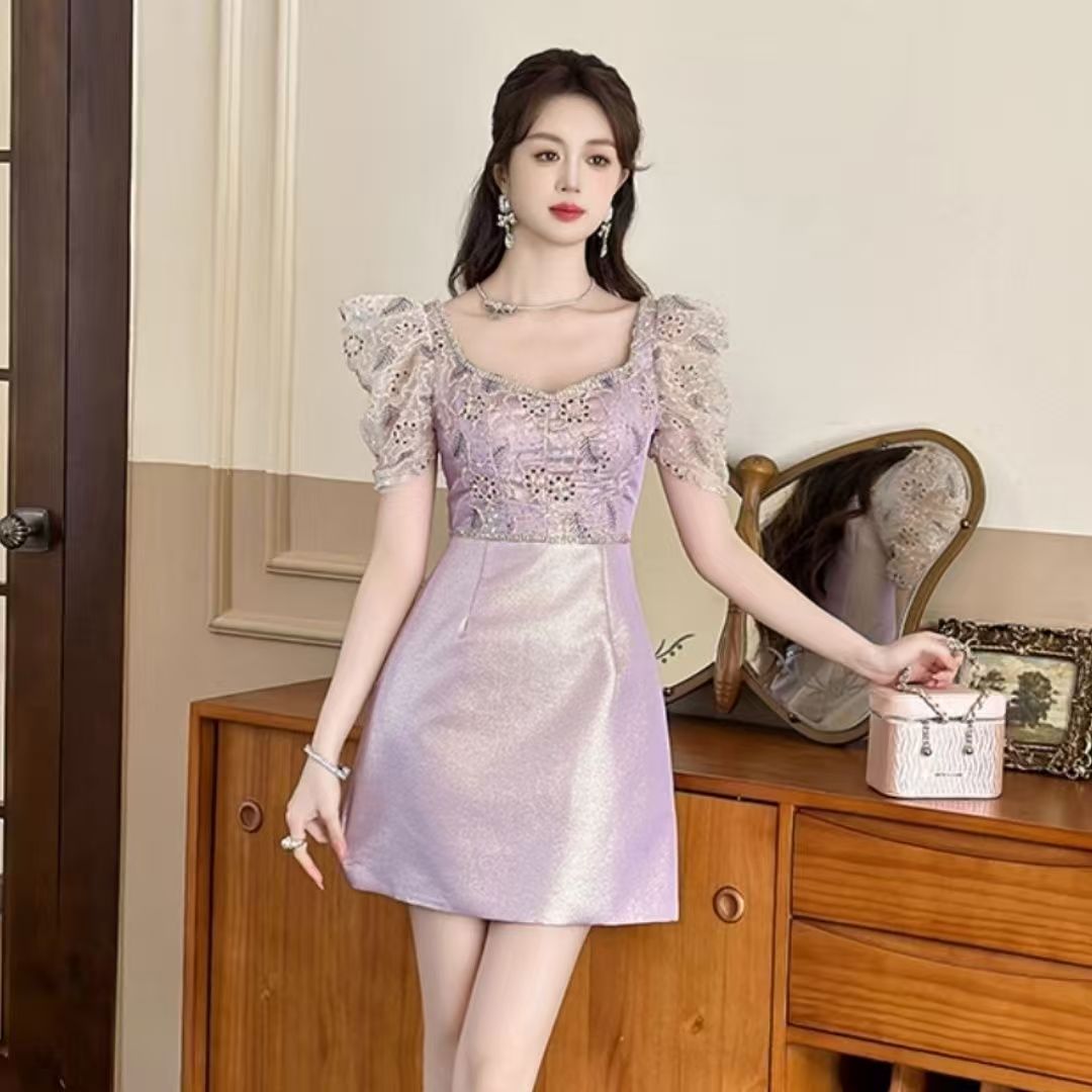 BY15221# 名媛紫色连衣裙夏季女蕾丝拼接高端生日宴会小礼服收腰a字短裙子服裝批發女裝批發服飾貨源