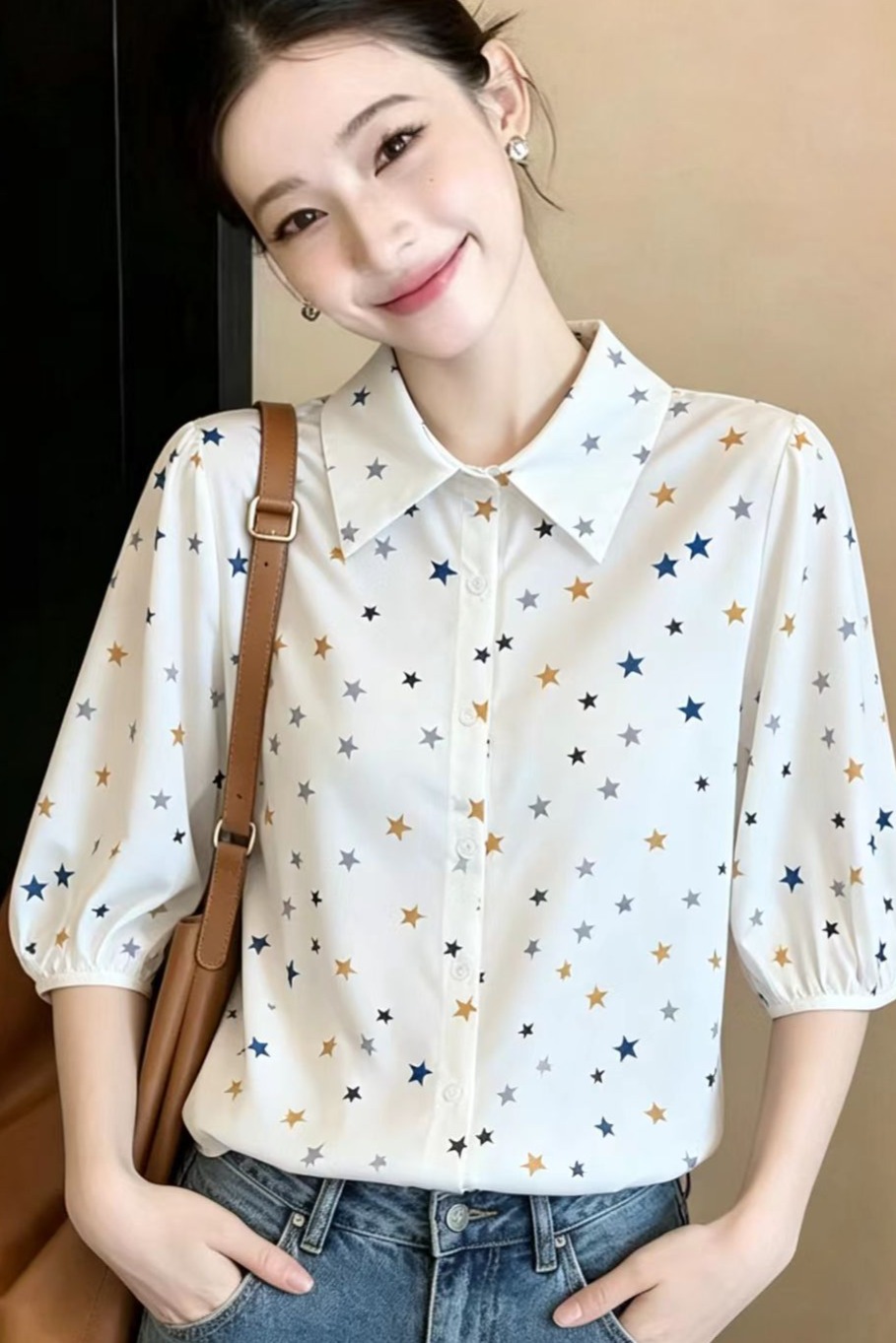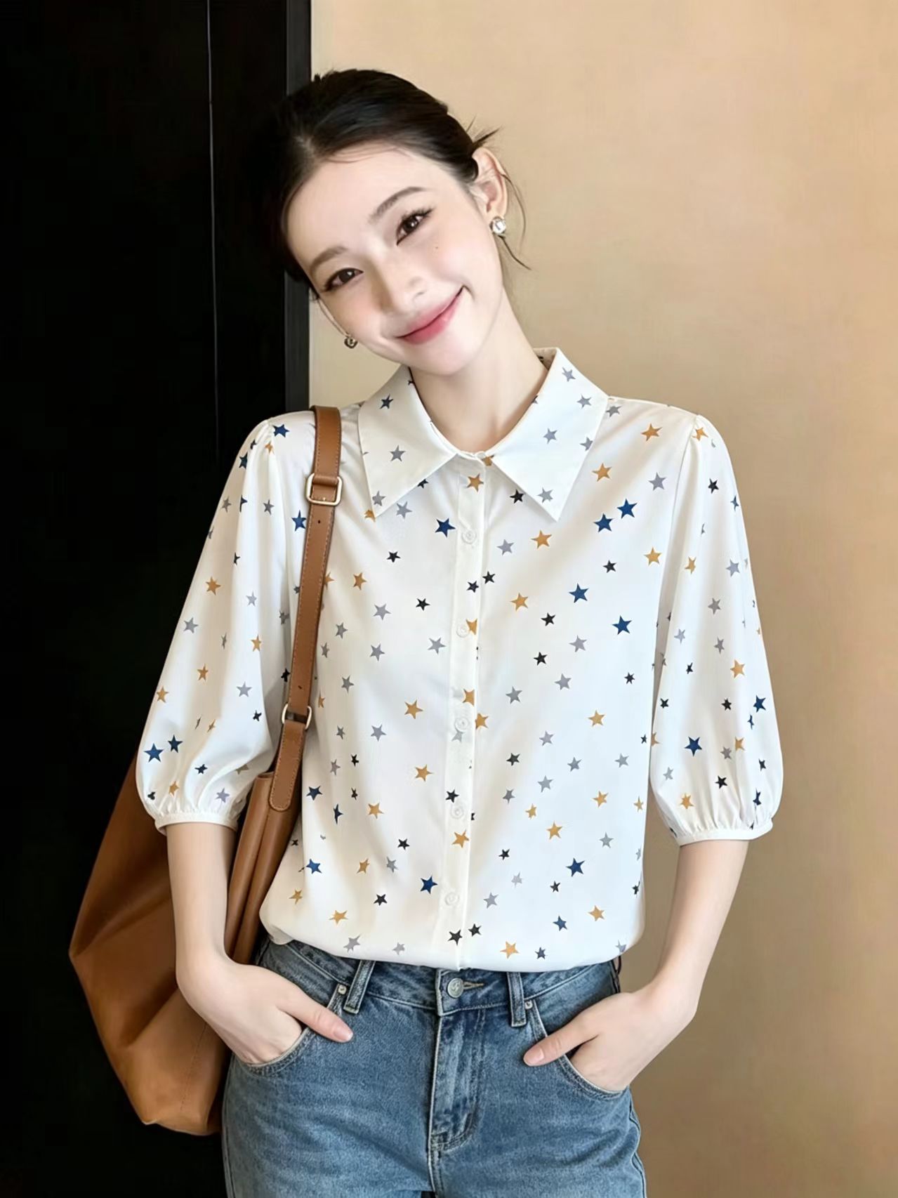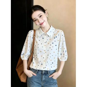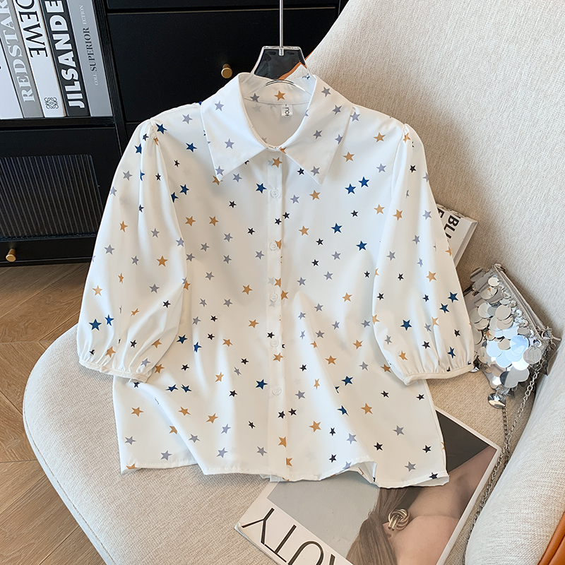 BY15253# 夏季新款宽松显瘦洋气百搭印花短袖衬衫女五分袖上衣服裝批發女裝批發服飾貨源