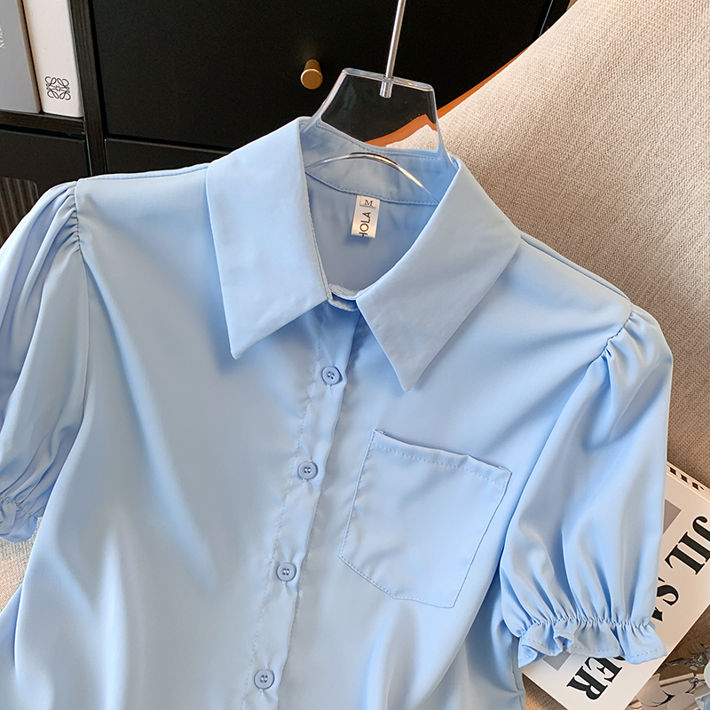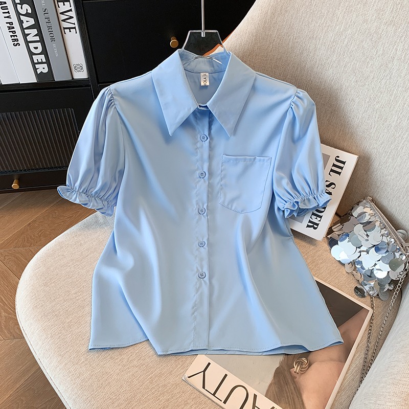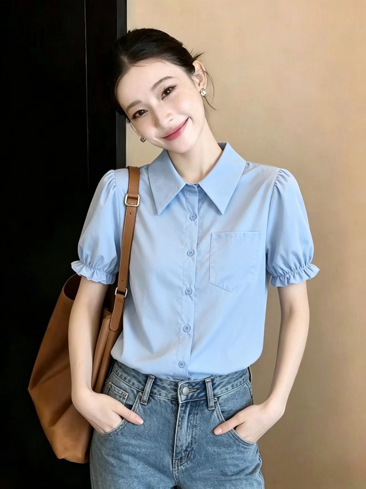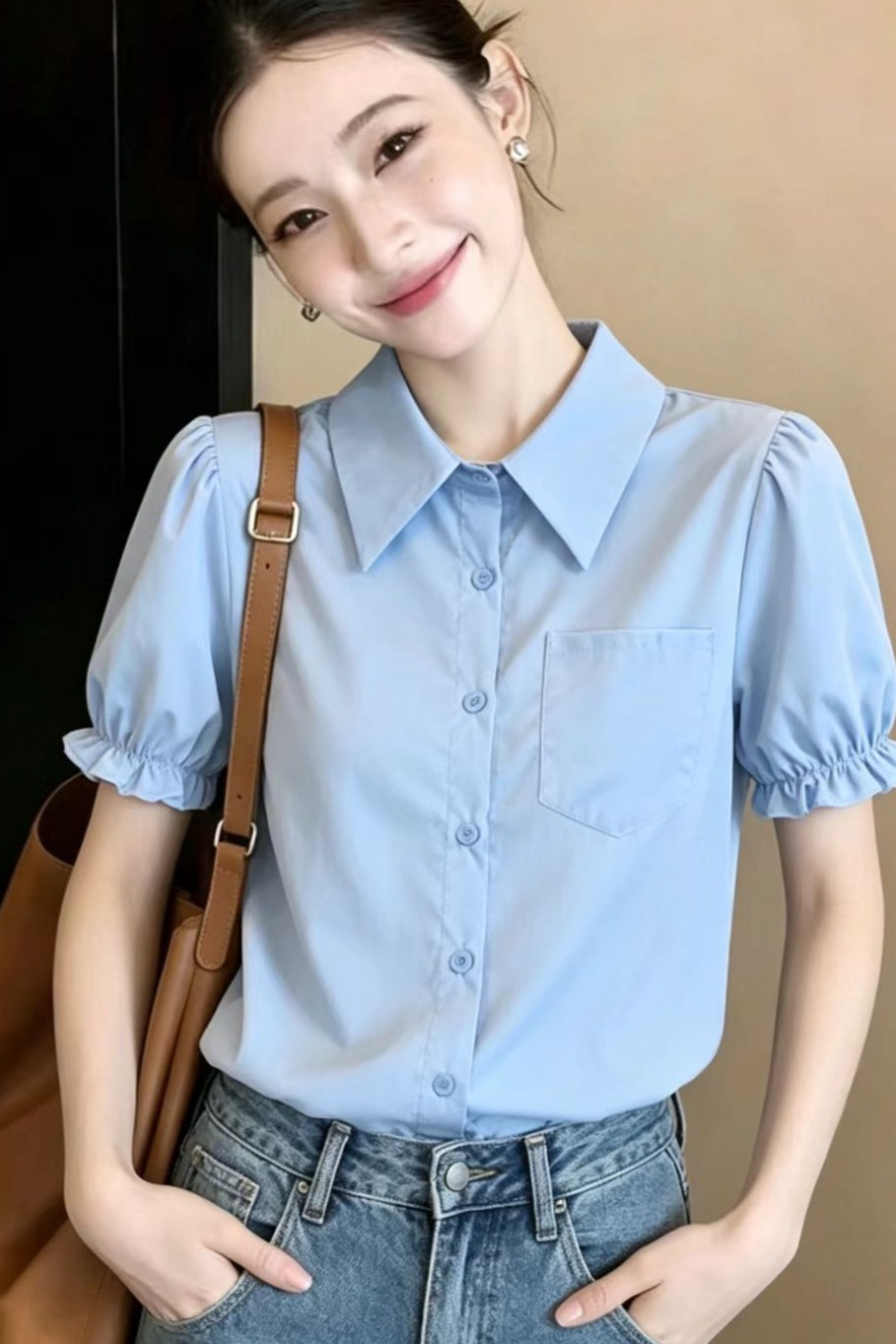 BY15256# 蓝色泡泡袖衬衫女夏季新款短袖洋气小衫女减龄上衣服裝批發女裝批發服飾貨源