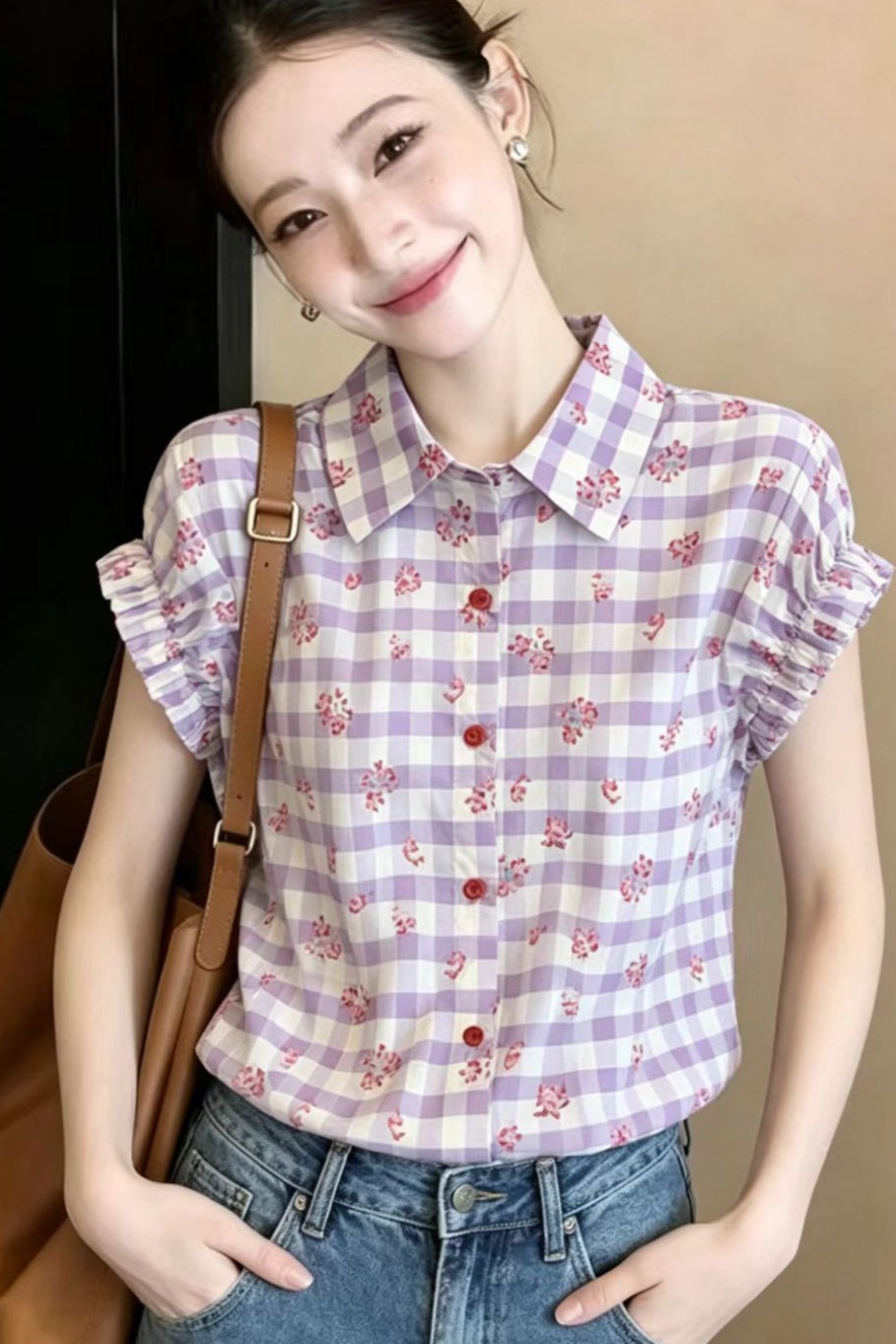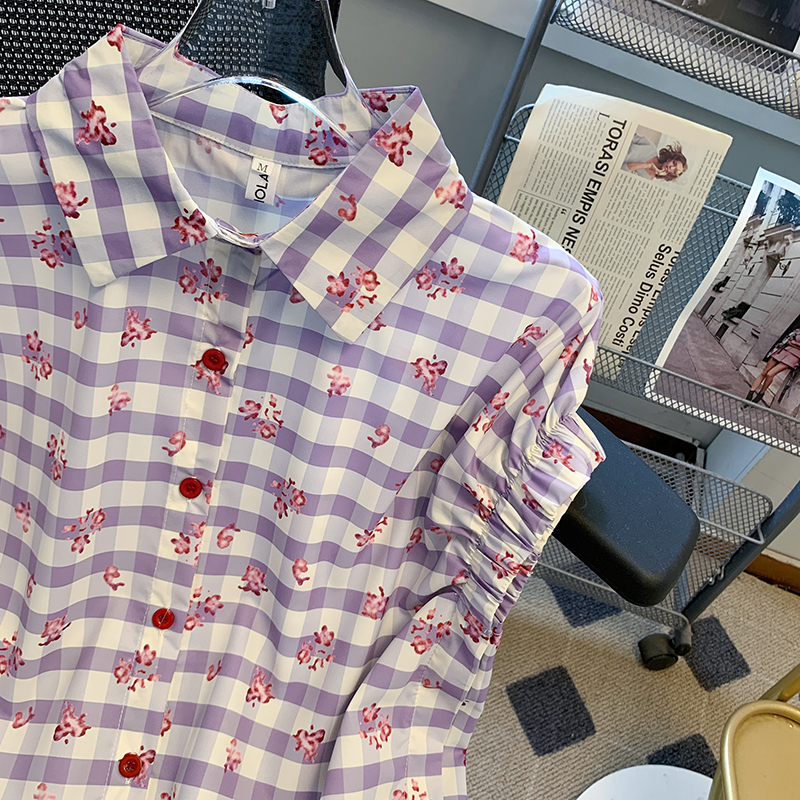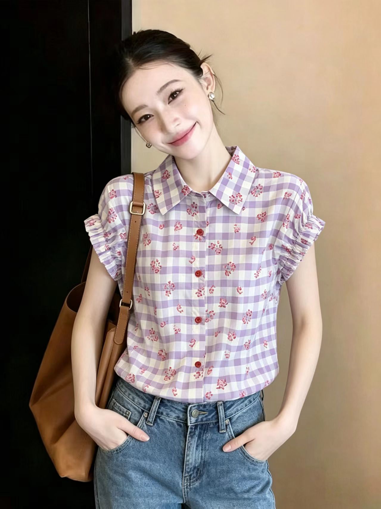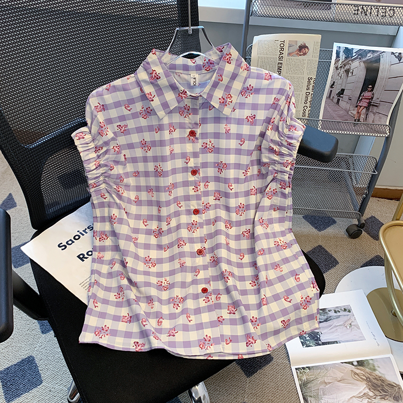 BY15257# 夏季新款港风复古格子衬衫设计感减龄印花褶皱短袖上衣服裝批發女裝批發服飾貨源