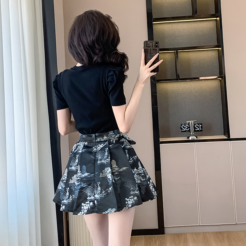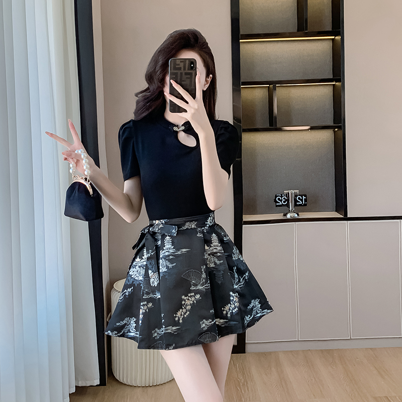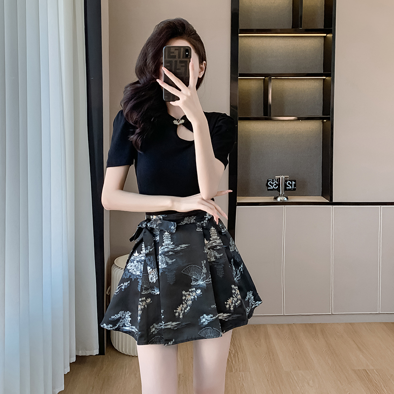 BY15266# 夏季新中式女装国风短款马面裙黑色百褶裙小个子时尚套装服裝批發女裝批發服飾貨源