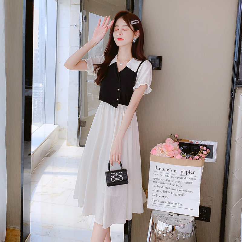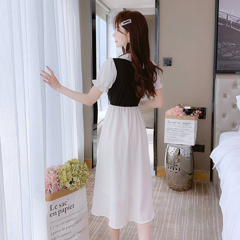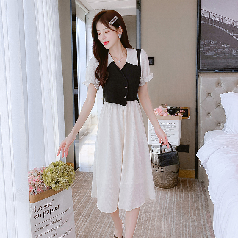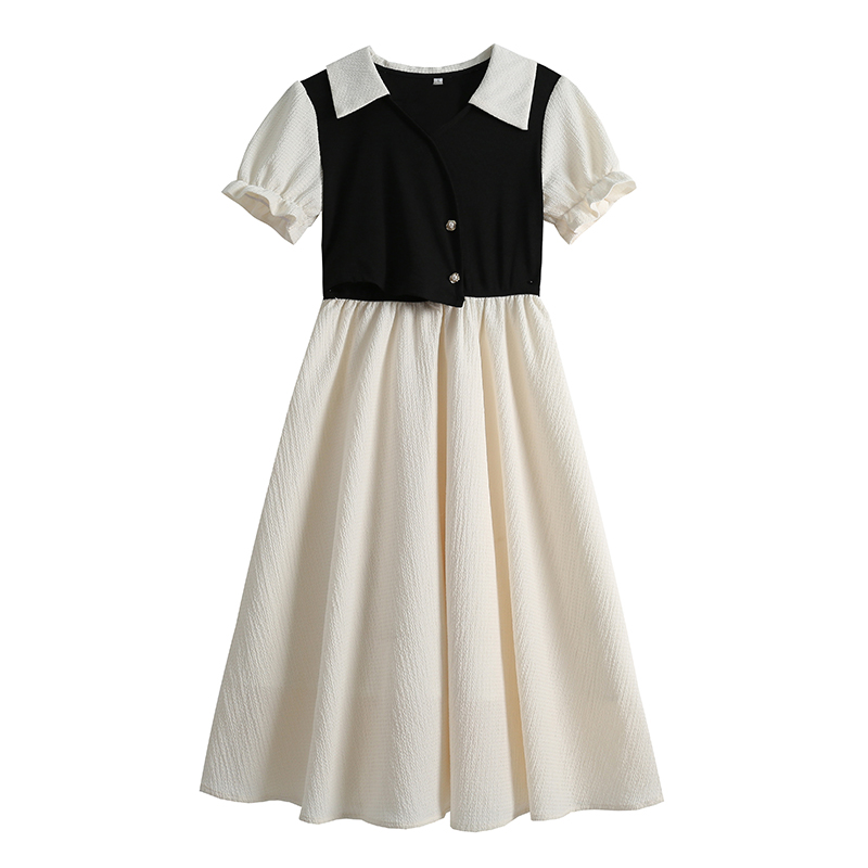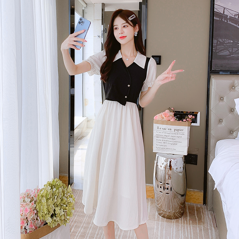 BY15276# 夏季新款拼色POLO领设计感泡泡袖连衣裙收腰显瘦遮肉长裙服裝批發女裝批發服飾貨源