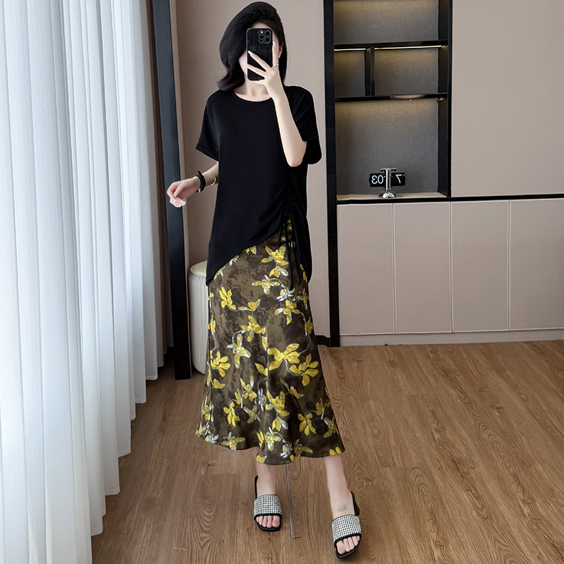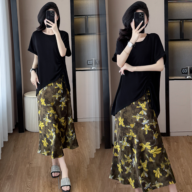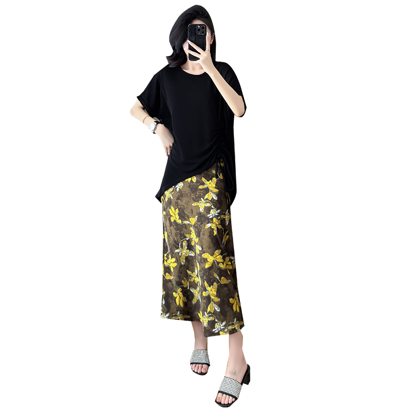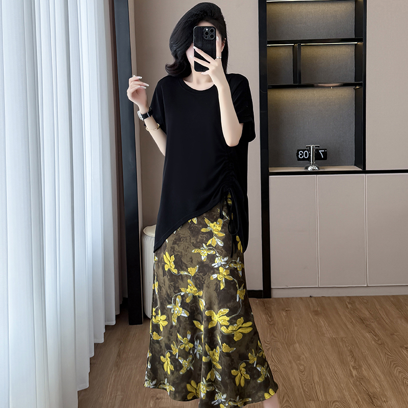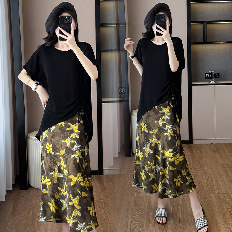 BY15282# 夏新款胖mm显瘦不规则下摆抽绳短袖+时尚碎花半身裙套装服裝批發女裝批發服飾貨源
