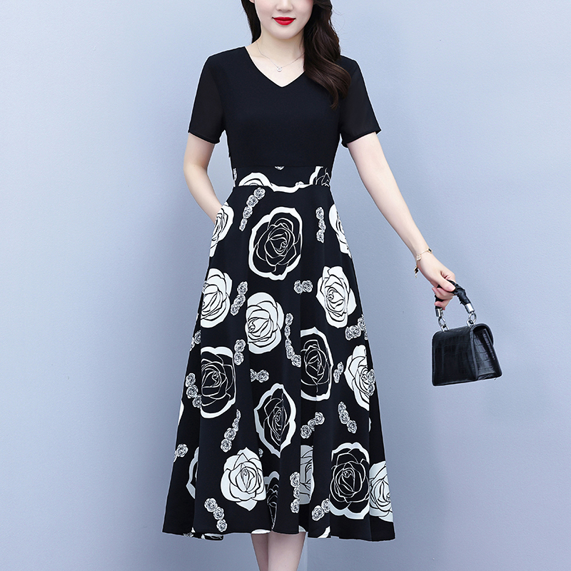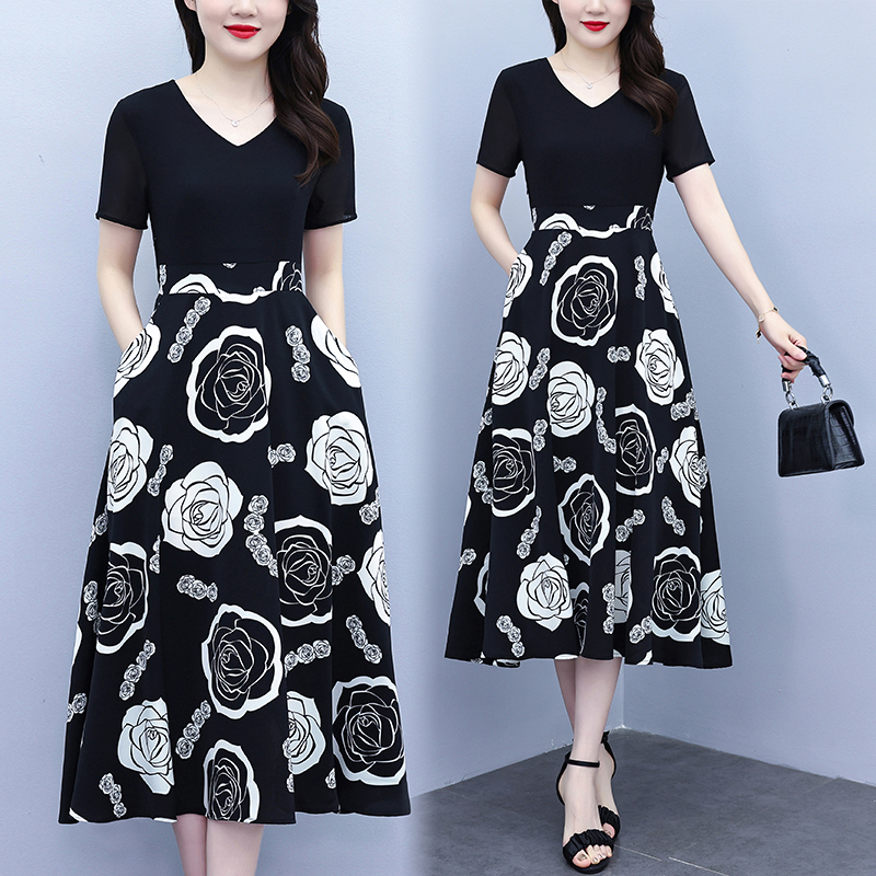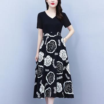 Home > 短袖连衣裙、夜店装 > BY15283# 新款大码时尚拼接印花连衣裙女夏收腰遮肚子显瘦气质长裙服裝批發女裝批發服飾貨源