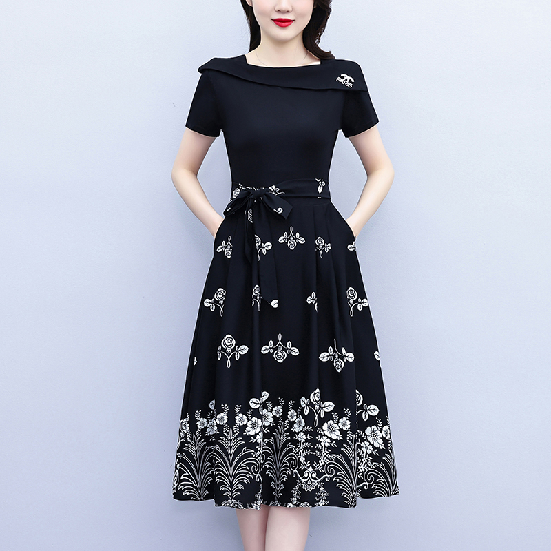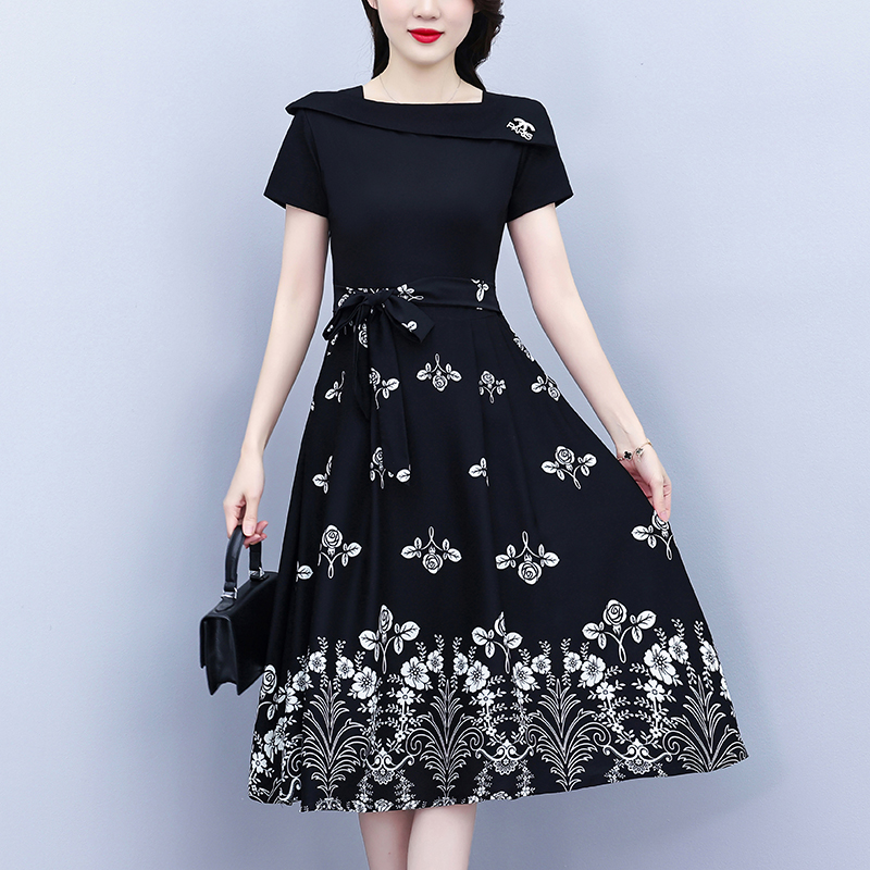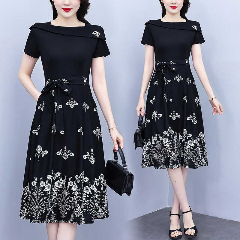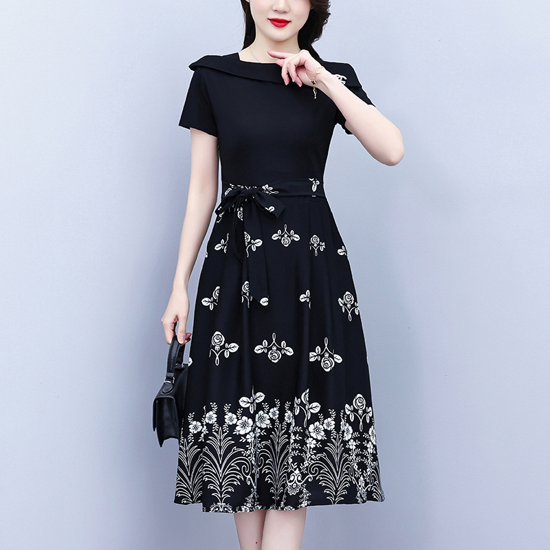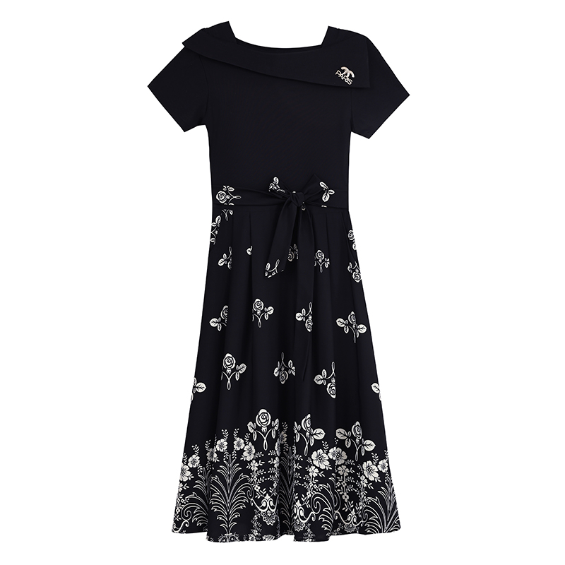 Home > 短袖连衣裙、夜店装 > BY15286# 新款气质收腰黑色短袖拼接假两件遮肚显瘦减龄印花连衣裙女夏服裝批發女裝批發服飾貨源