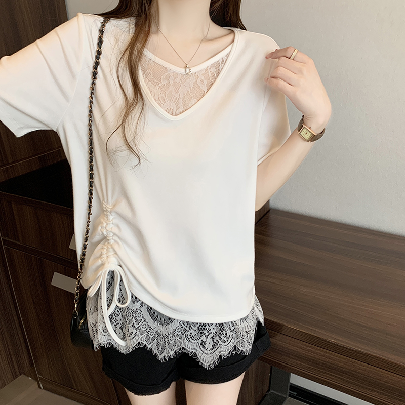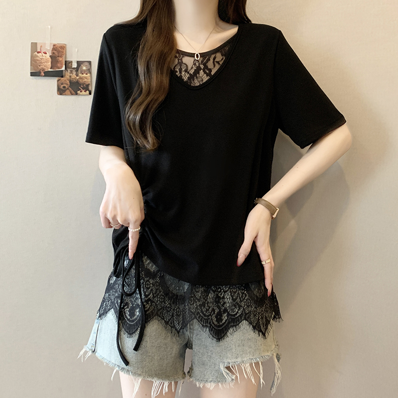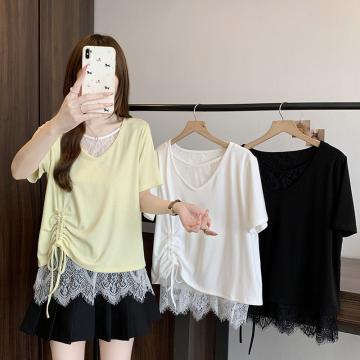 BY15324# 夏装新款胖mm大码女设计感拼接蕾丝花边宽松显瘦短袖T恤服裝批發女裝批發服飾貨源