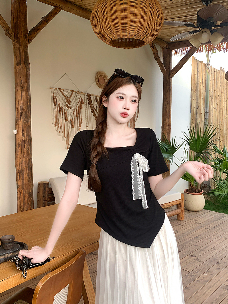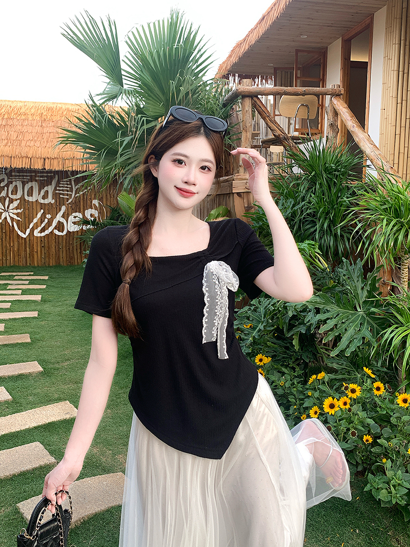 BY15326# 夏装新款胖mm大码女甜美方领蕾丝蝴蝶结不规则短袖T恤服裝批發女裝批發服飾貨源