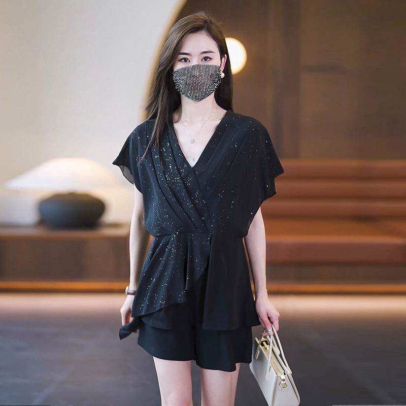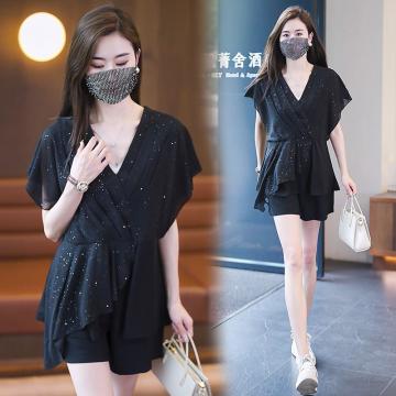 BY15330# 大码女装套装短袖雪纺上衣夏季胖MM修身显瘦简约韩版V领小衫服裝批發女裝批發服飾貨源