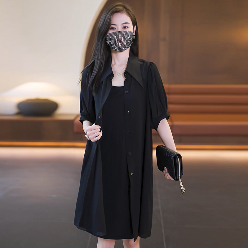 BY15331# 夏季短袖黑色雪纺衬衫领连衣裙套装胖MM气质显瘦吊带裙两件套服裝批發女裝批發服飾貨源