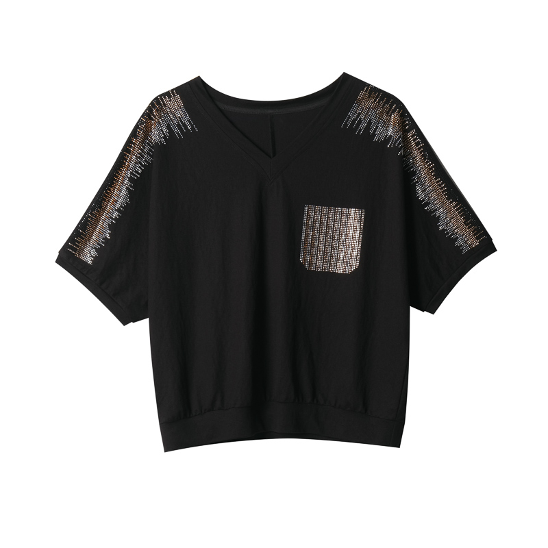 BY15334# 大码女装T恤夏季胖MM宽松显瘦休闲V领烫钻短袖上衣女服裝批發女裝批發服飾貨源