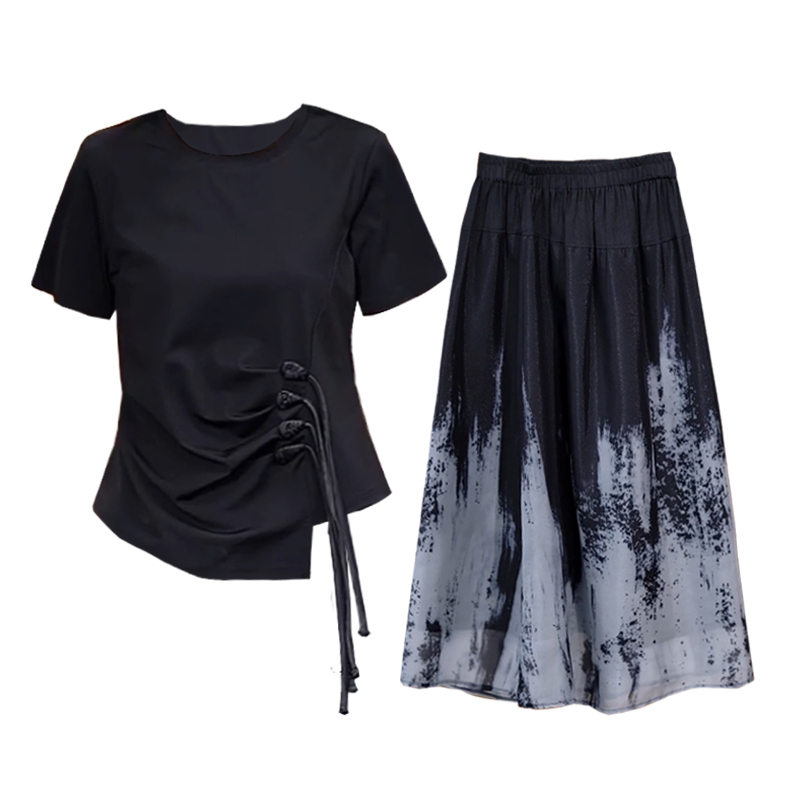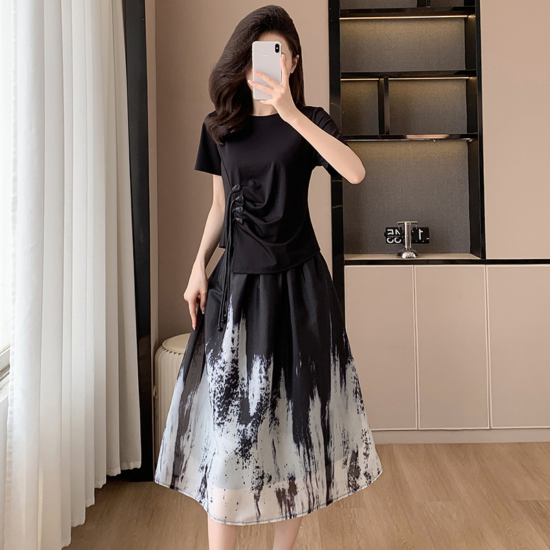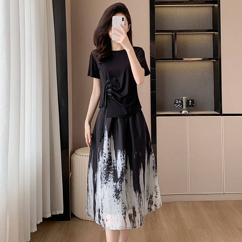 BY15338# 夏季新款大码女装套装裙子时尚胖MM显瘦新国风宽松型T恤两件套女服裝批發女裝批發服飾貨源
