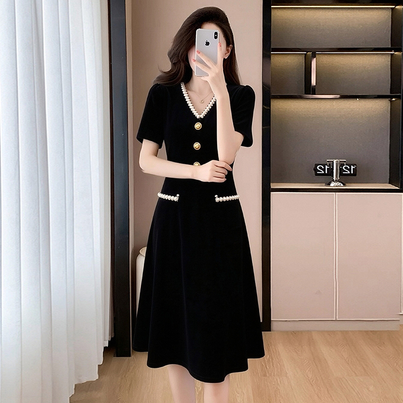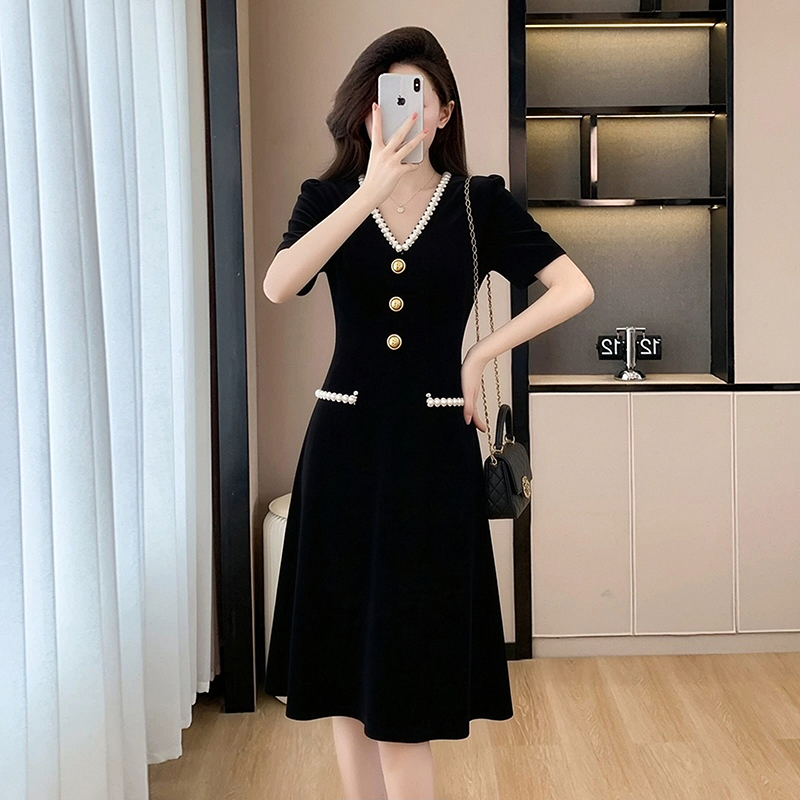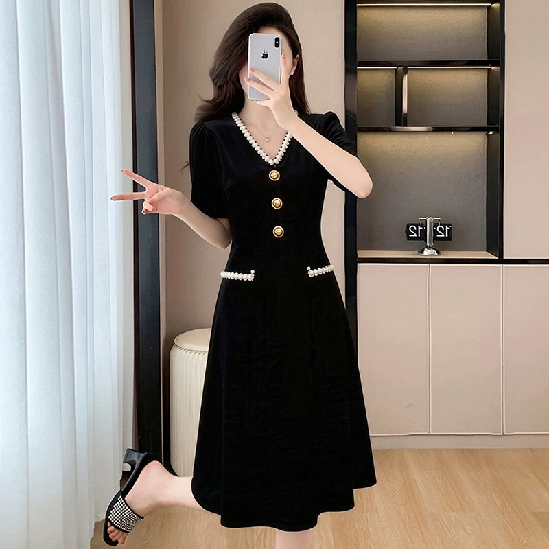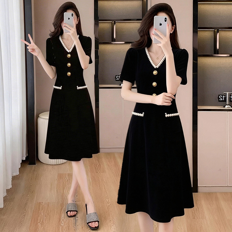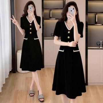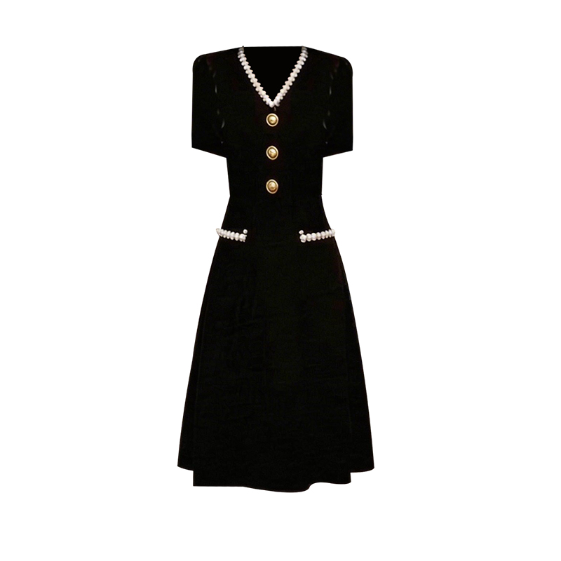 BY15420# 夏季新款小香风黑色V领高端气质收腰遮肚显瘦A字中长款连衣裙 服裝批發女裝批發服飾貨源