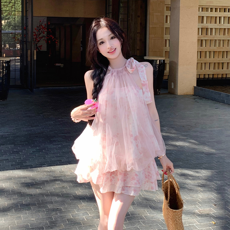 BY15438# 法式网纱挂脖无袖上衣半身裙裤两件套装碎花气质可爱甜美 服裝批發女裝批發服飾貨源