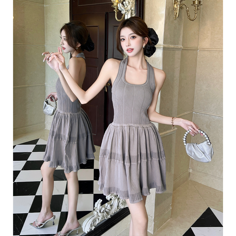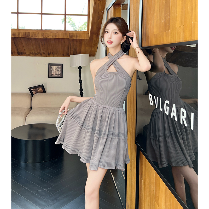 BY15442# 高级感挂脖交叉针织连衣裙女夏设计感修身显瘦礼服短裙子 服裝批發女裝批發服飾貨源