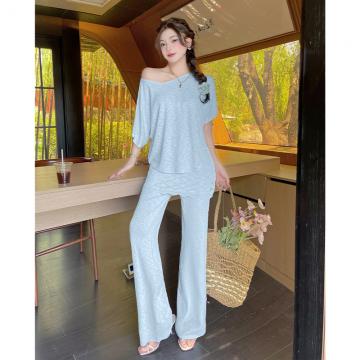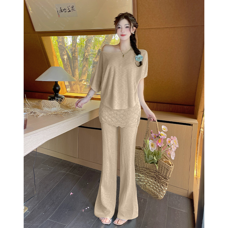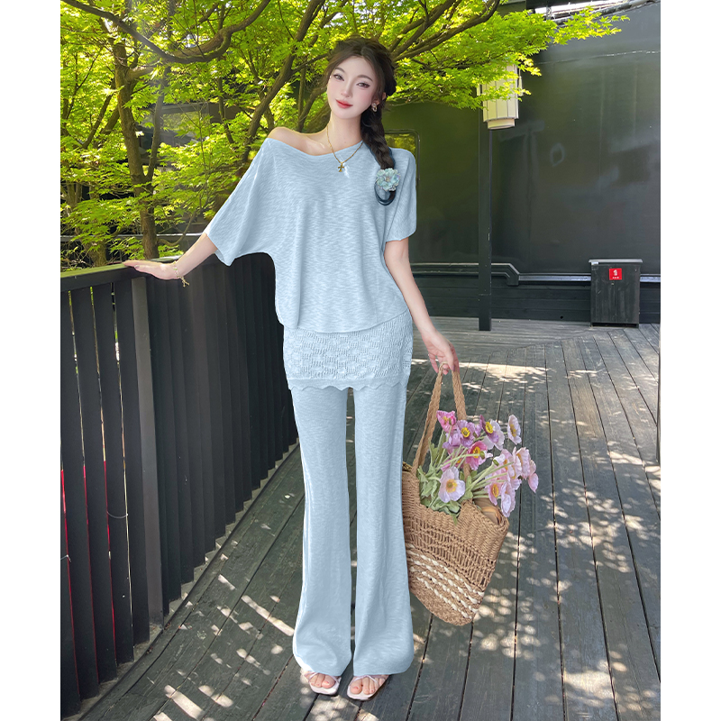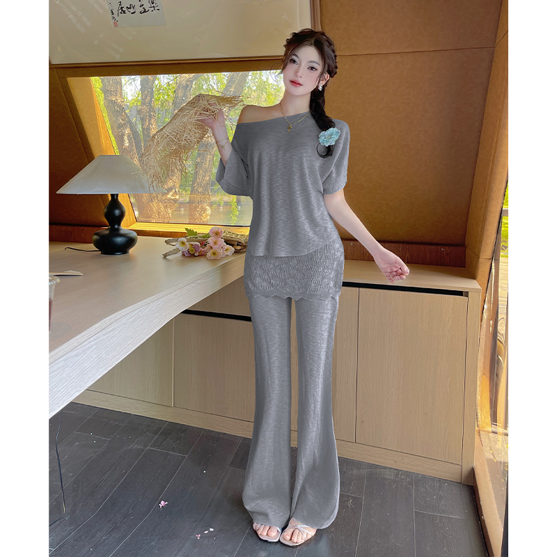 BY15454# 韩系慵懒斜肩上衣显瘦百搭屁帘拼接休闲裤时尚套装夏季 服裝批發女裝批發服飾貨源