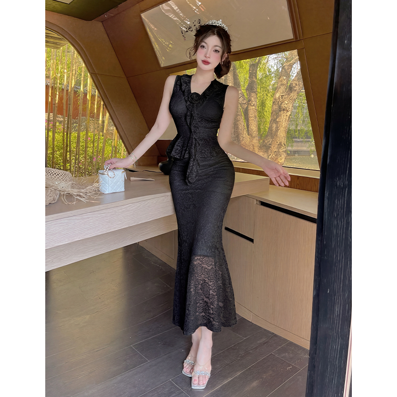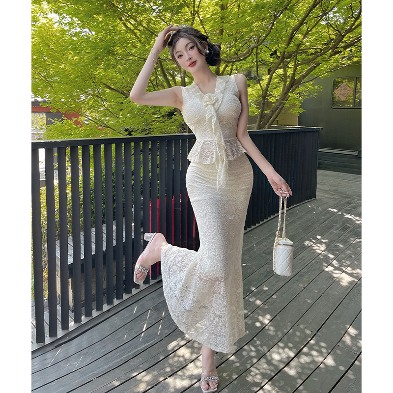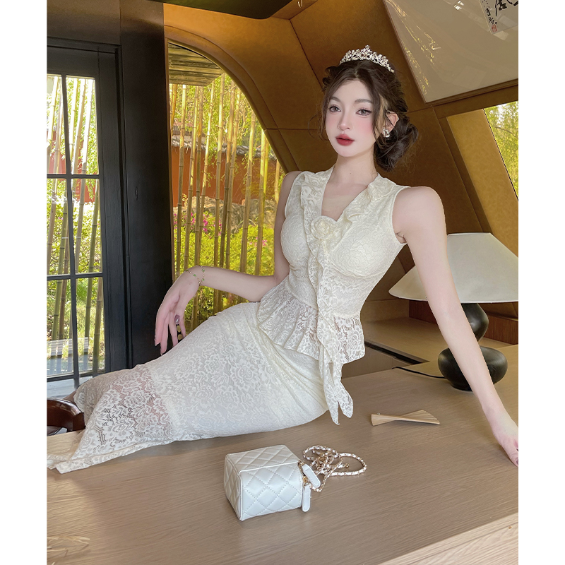 BY15456# 法式V领蕾丝无袖修身上衣高腰半身长裙套装名媛鱼尾裙夏 服裝批發女裝批發服飾貨源