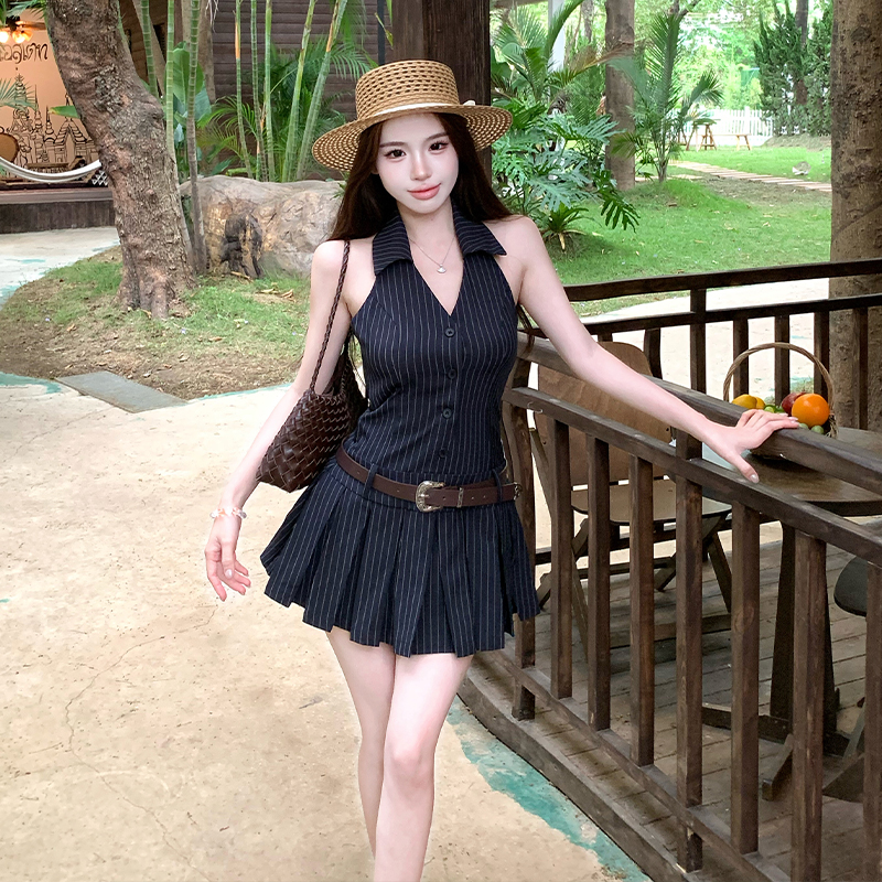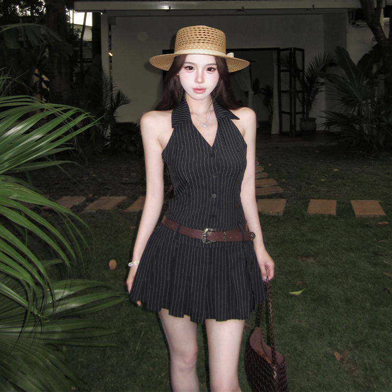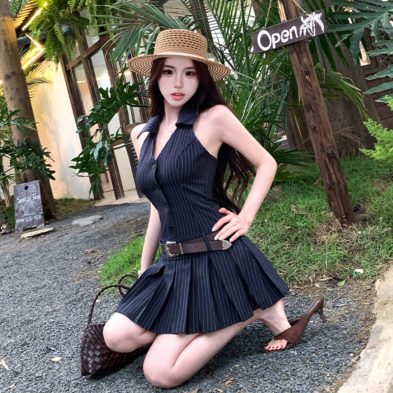 BY15462# 纯欲辣妹无袖V领挂脖条纹连衣裙气质性感御姐风a字百褶裙 服裝批發女裝批發服飾貨源