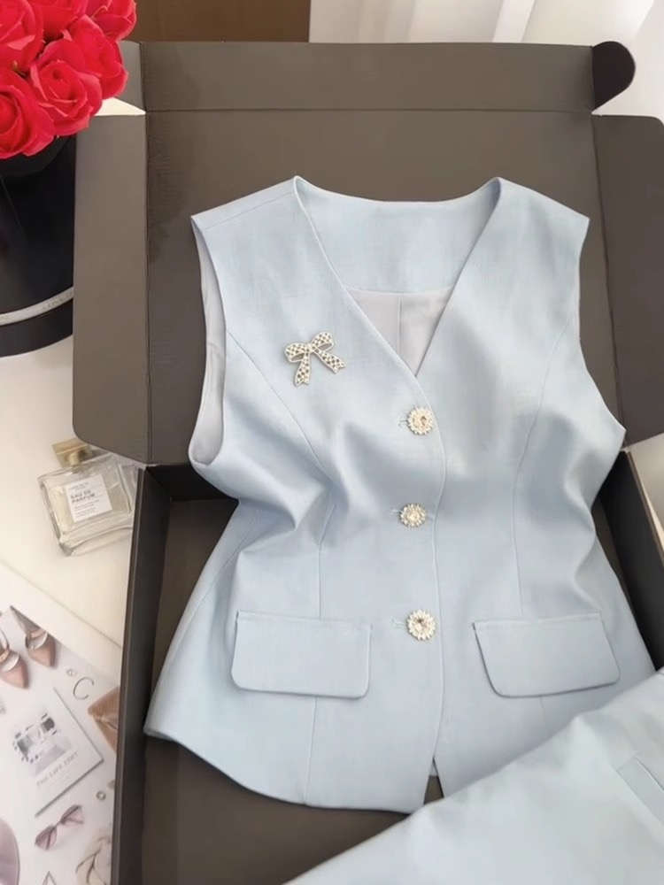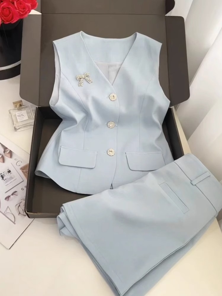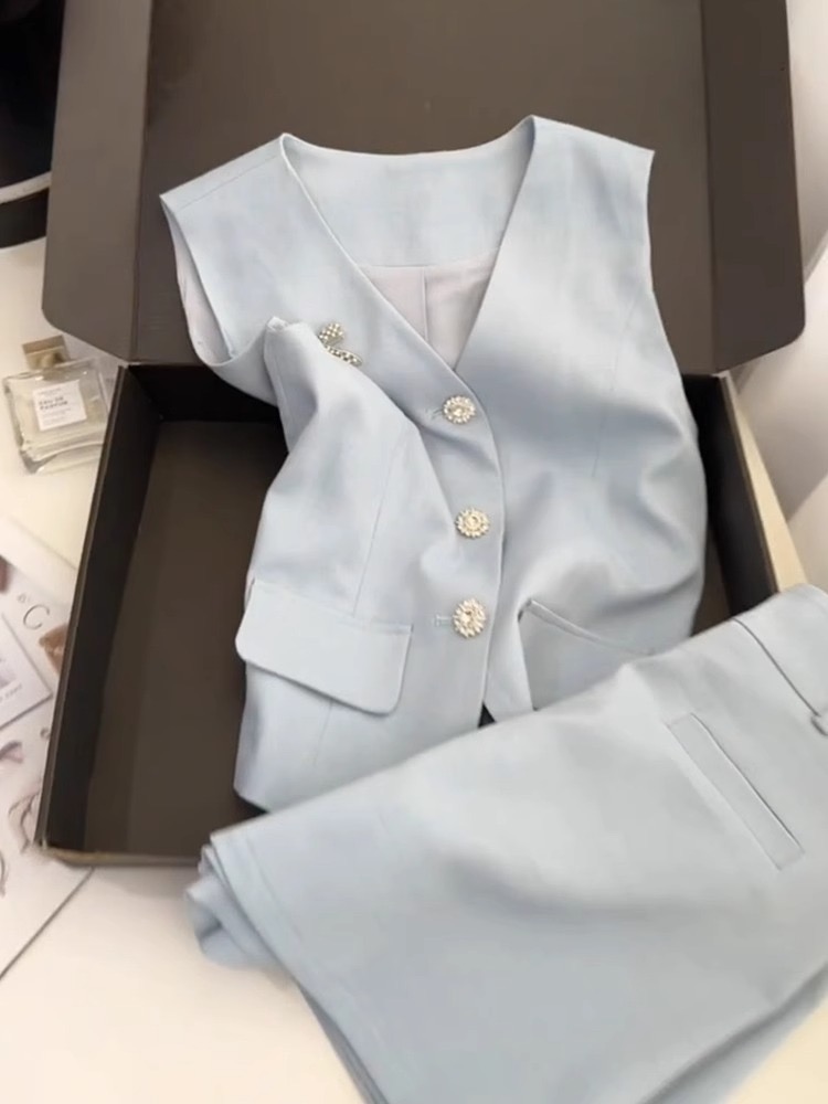 BY15469# 夏季穿搭一整套高级感欧货时尚洋气减龄小香风浅蓝色马甲短裤套装 服裝批發女裝批發服飾貨源