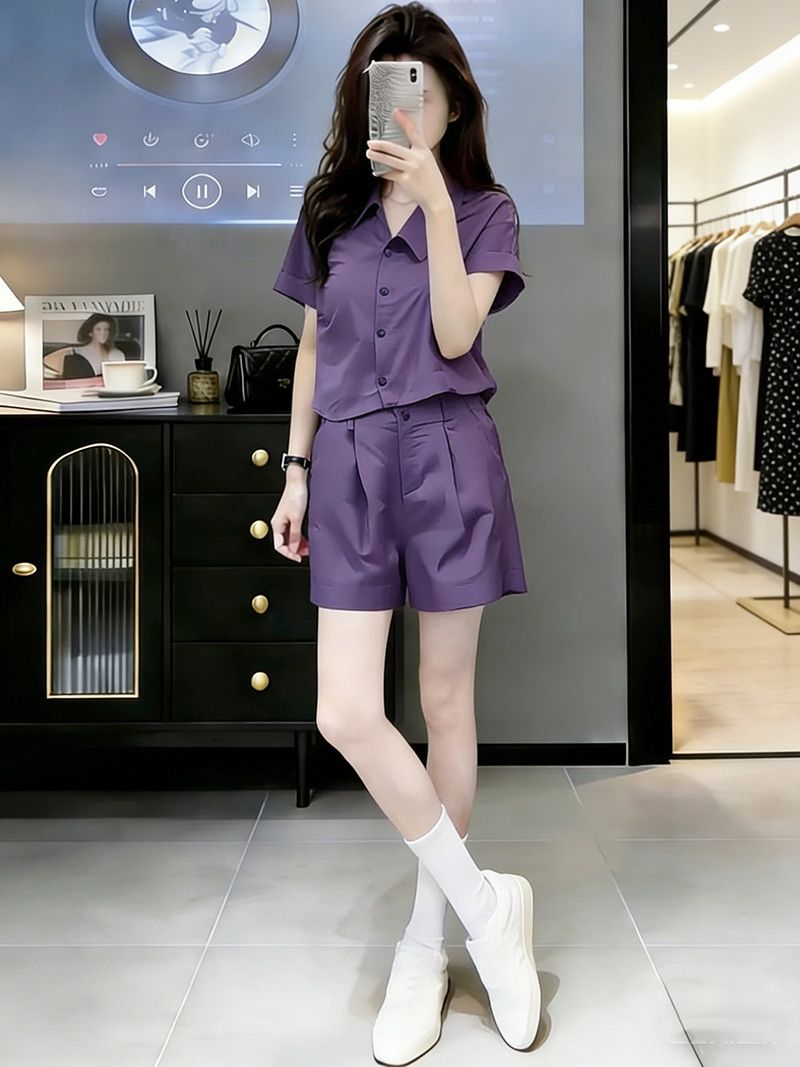 BY15473# 减龄时尚休闲女士夏装今年爆款显瘦紫色翻领短袖两件套女装 服裝批發女裝批發服飾貨源