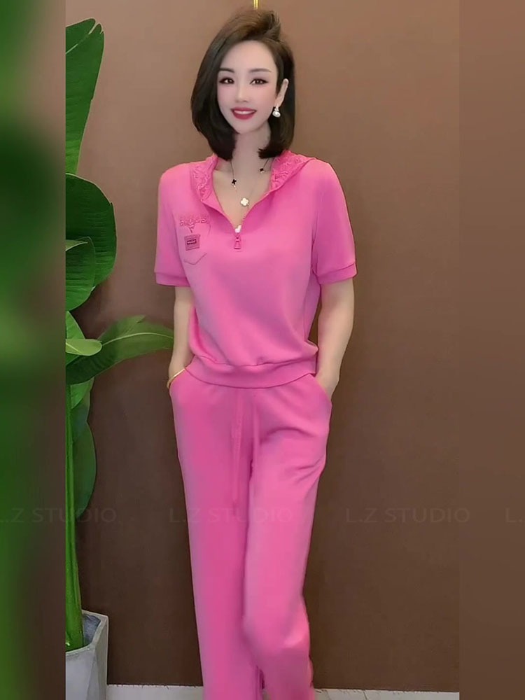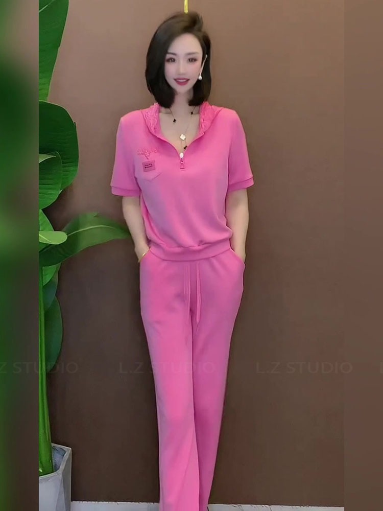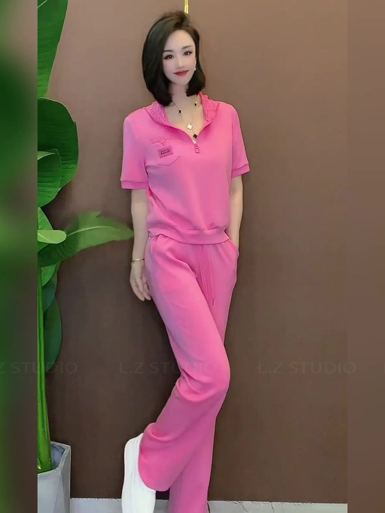 BY15477# 夏季日常休闲运动套装女甜酷小个子粉色短袖直筒裤两件套 服裝批發女裝批發服飾貨源