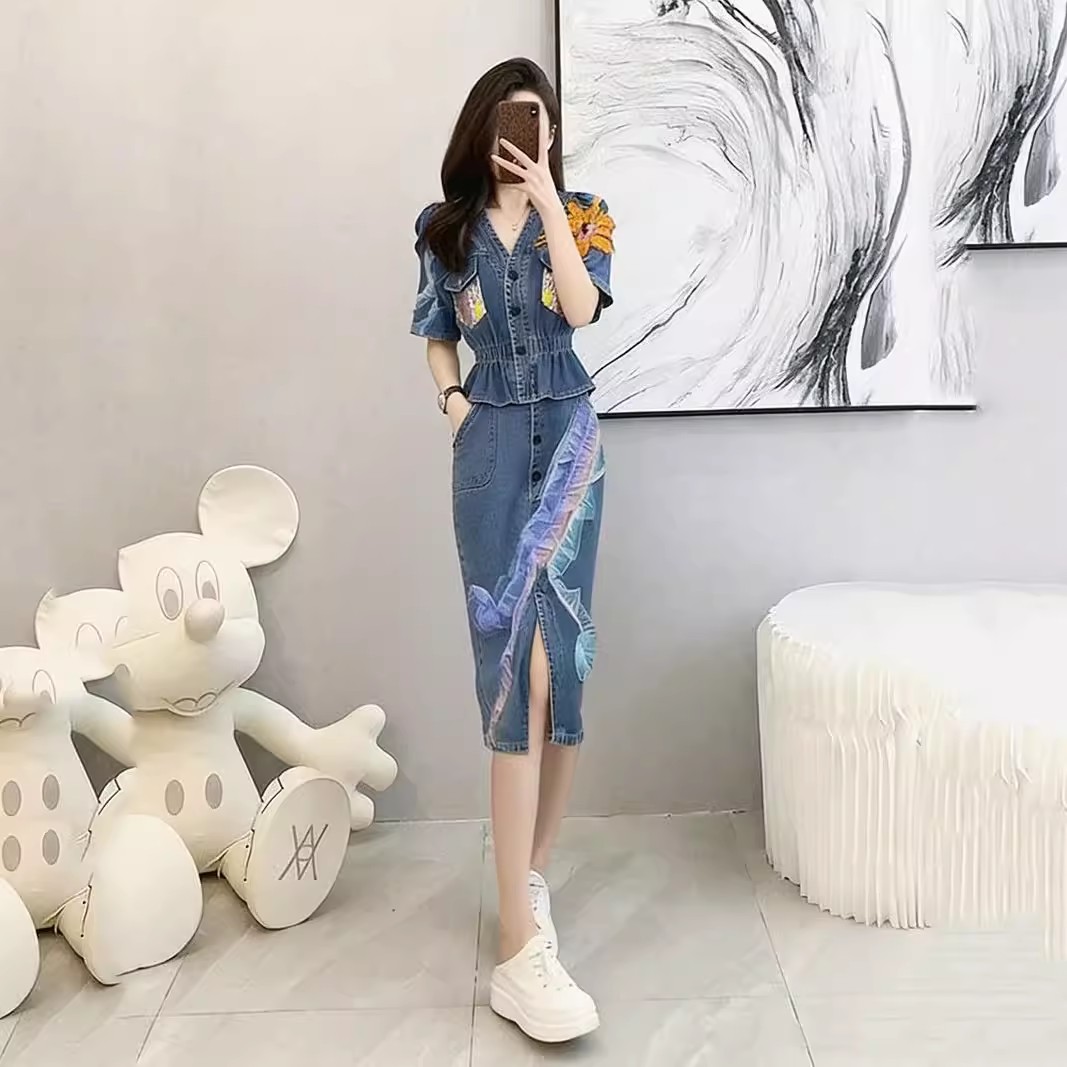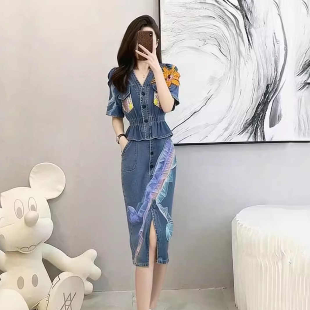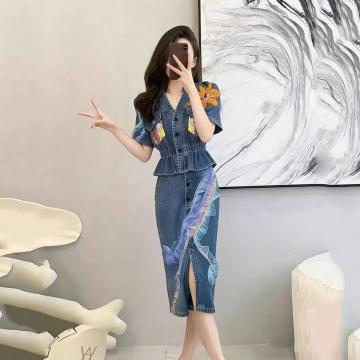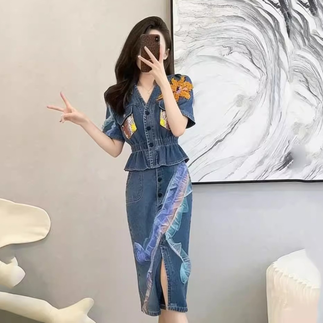 BY15479# 法式牛仔连衣裙套装半身裙时尚套装女夏季新款减龄休闲两件套 服裝批發女裝批發服飾貨源