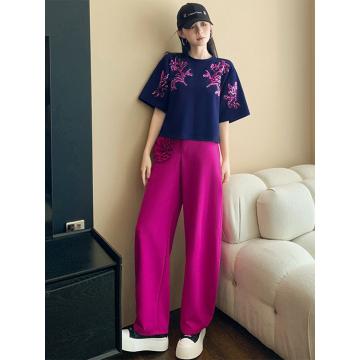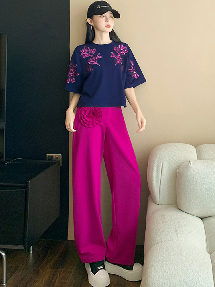 蓝色上衣+玫红色裤子