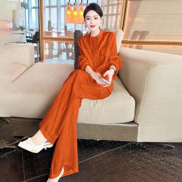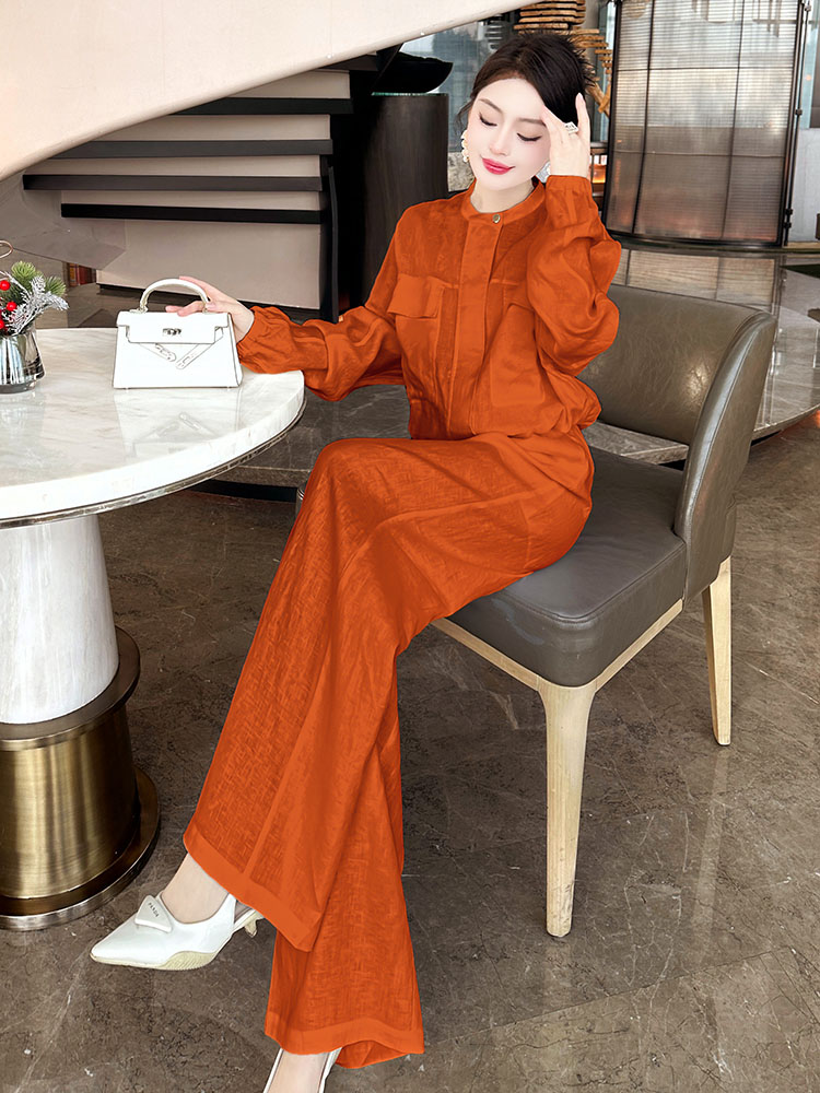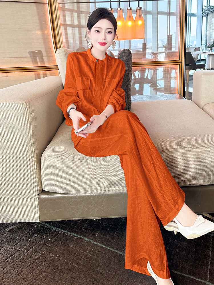 BY15483# 春季减龄穿搭一整套轻熟风橘红色工装衬衫阔腿裤两件套装女 服裝批發女裝批發服飾貨源