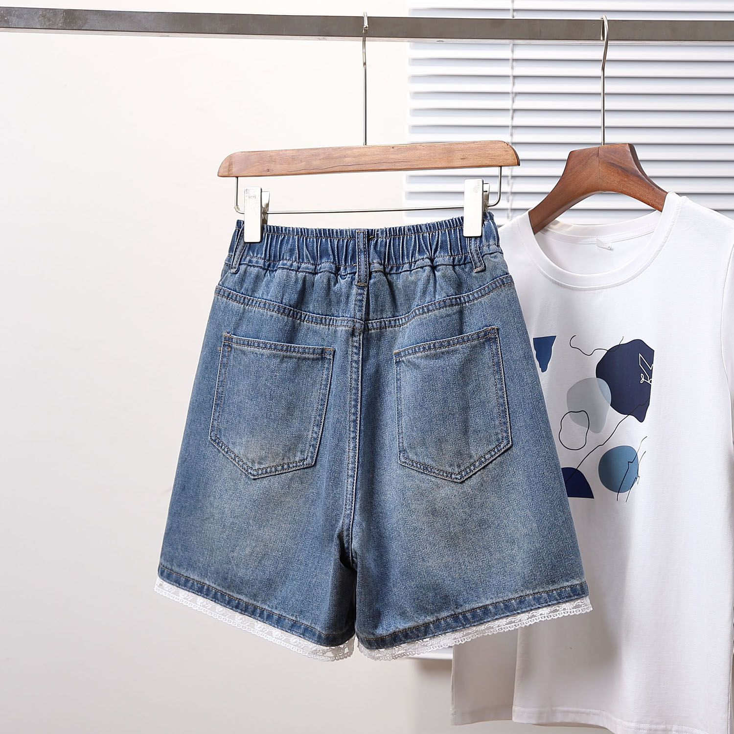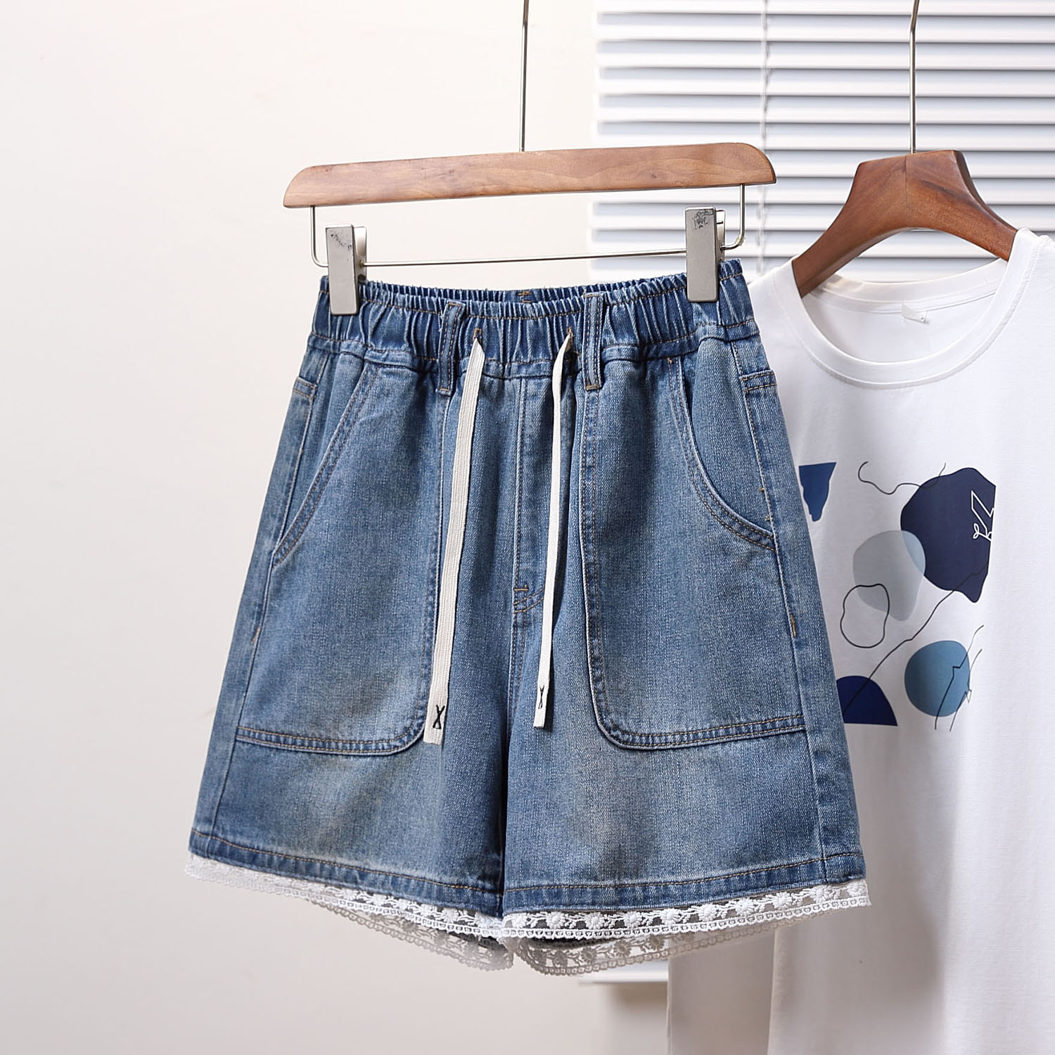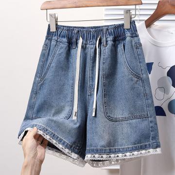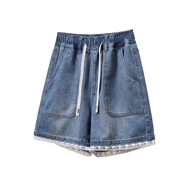 BY15492# 夏款大码松紧腰宽松蕾丝阔腿四分牛仔短裤胖MM显瘦高A字热裤 服裝批發女裝批發服飾貨源