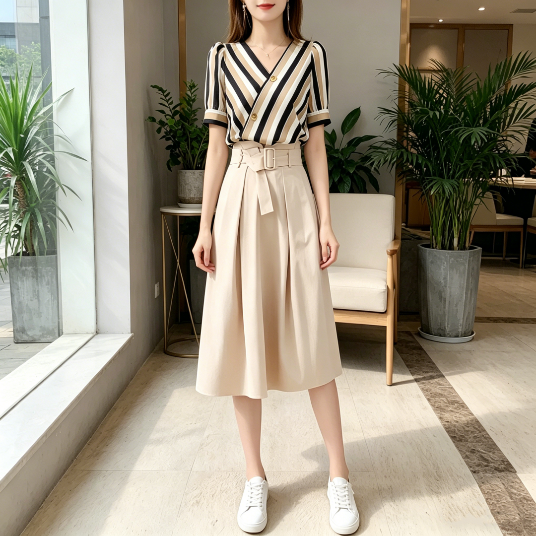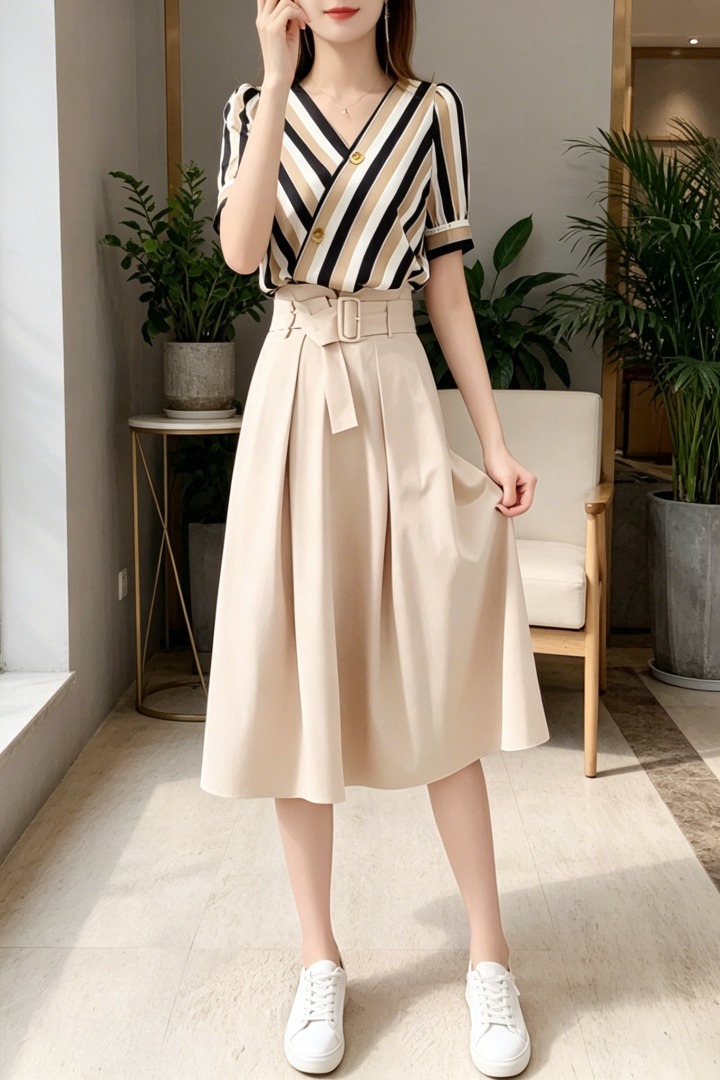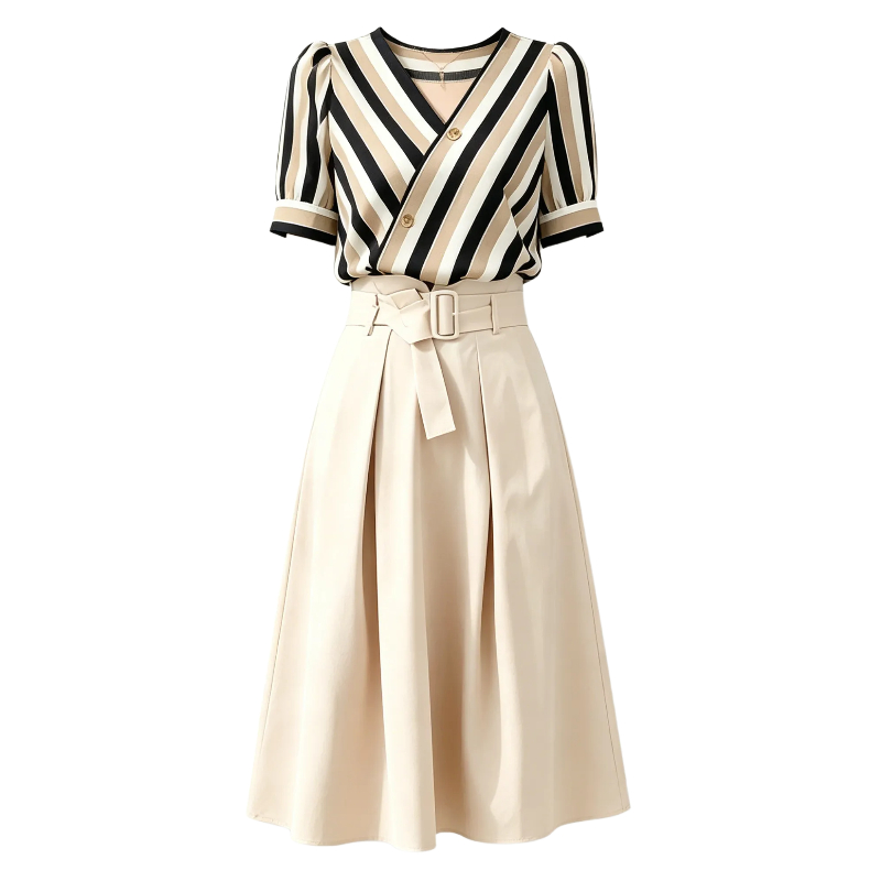 BY15499# 夏季新款条纹两件套女时尚气质套装裙显瘦休闲高腰系带裙子女 服裝批發女裝批發服飾貨源