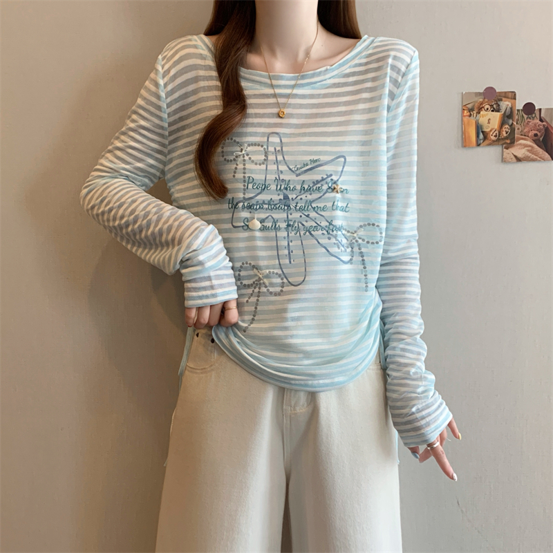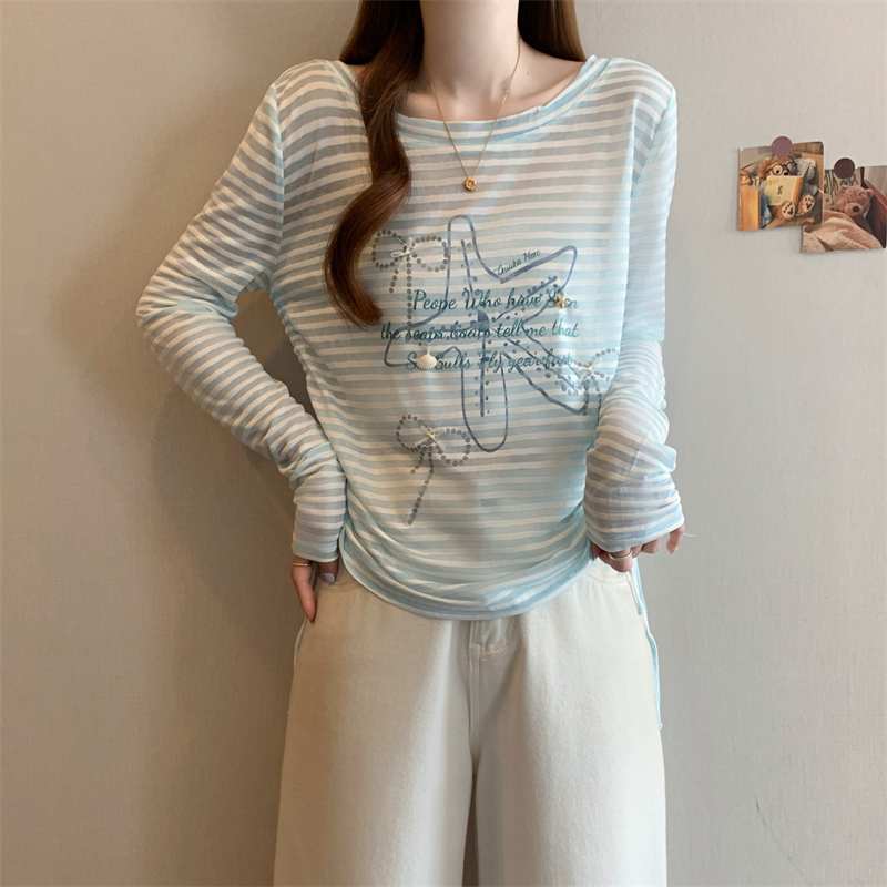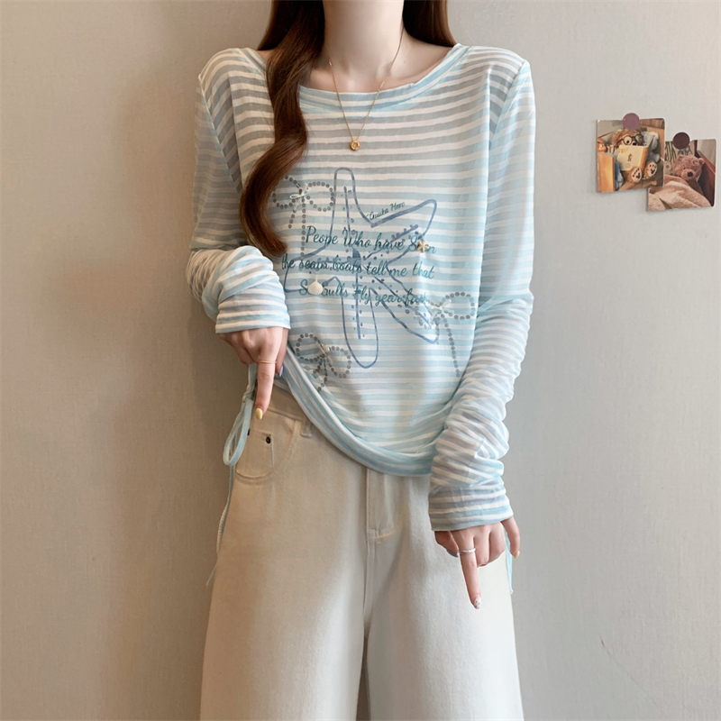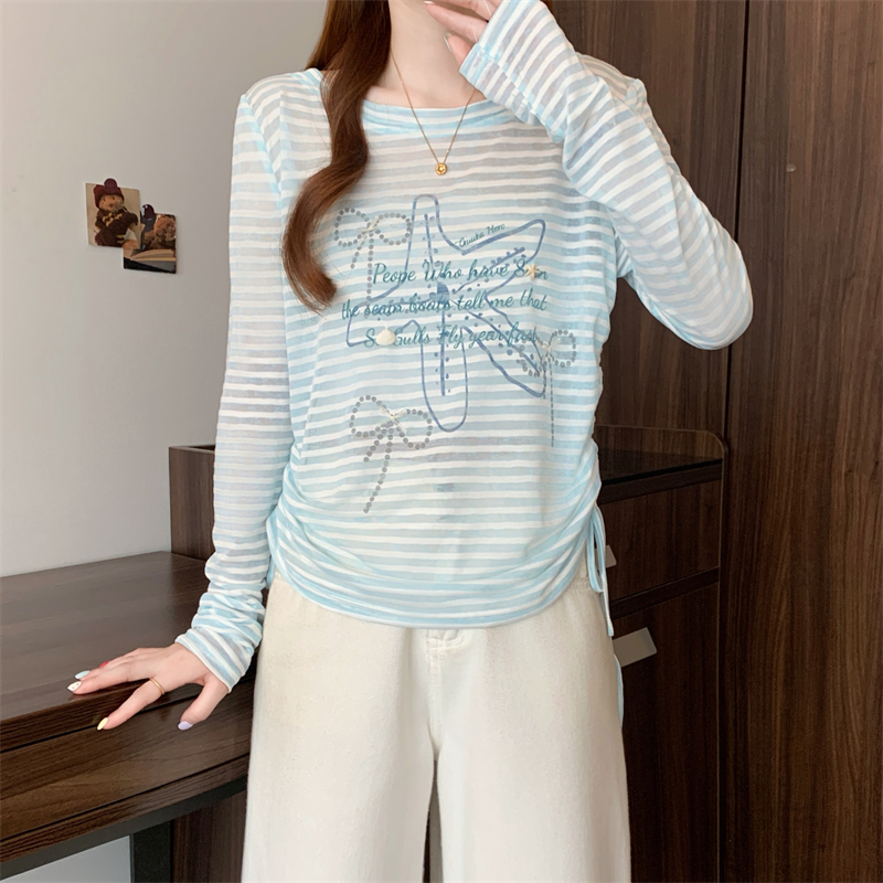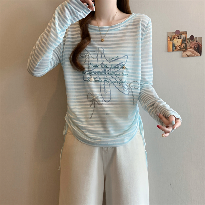BY15508# 大码女装蓝色露背条纹罩衫韩系甜美度假长袖抽绳防晒衣 服裝批發女裝批發服飾貨源