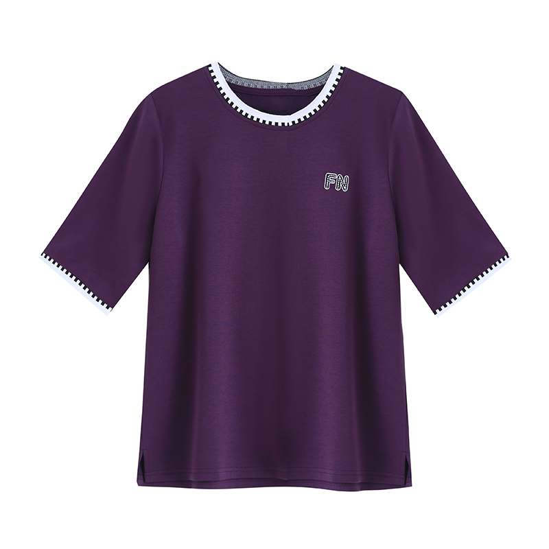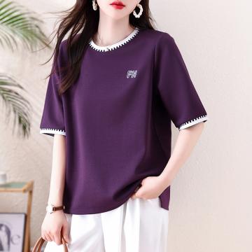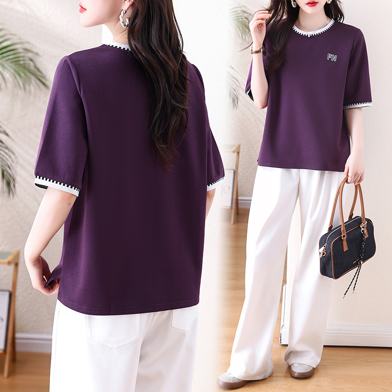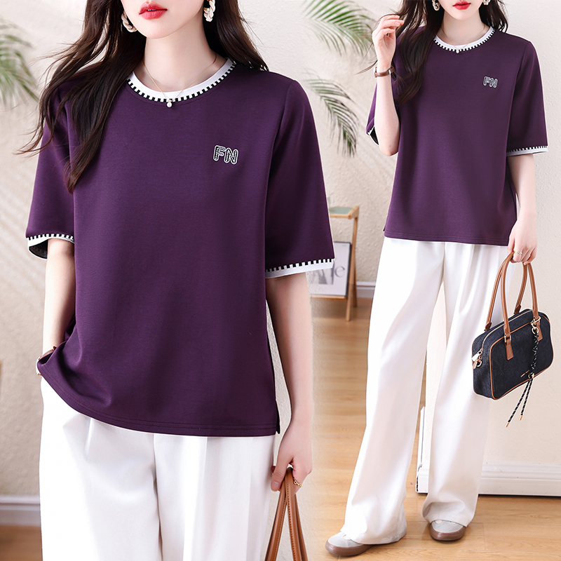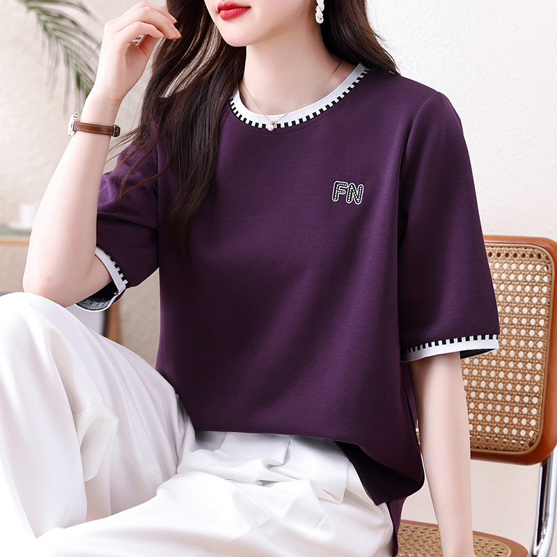 BY15510# 新款撞色圆领T恤女紫色宽松中袖简约刺绣显瘦百搭胖MM打底衫 服裝批發女裝批發服飾貨源