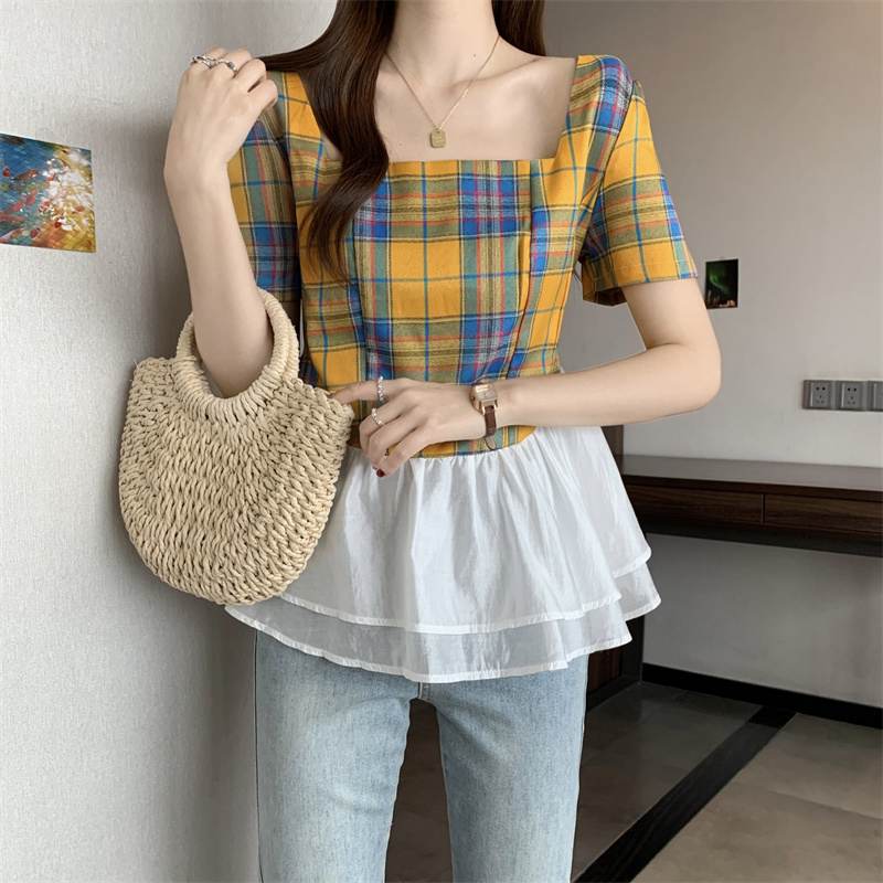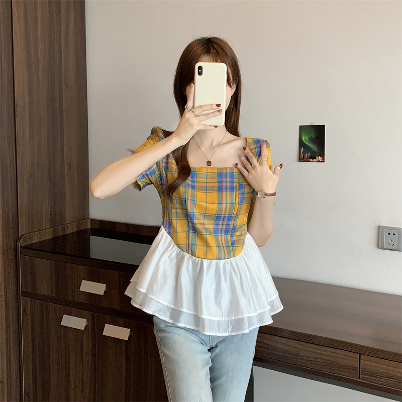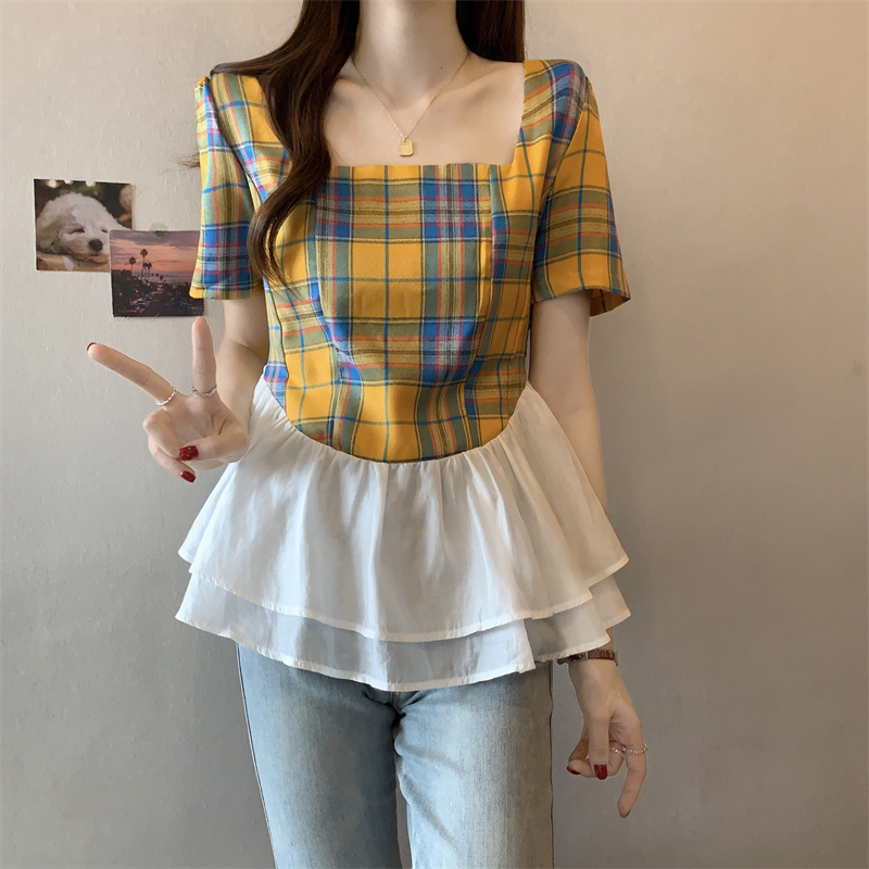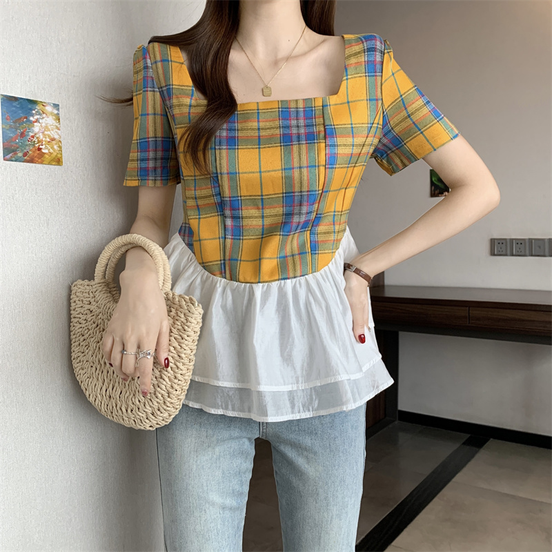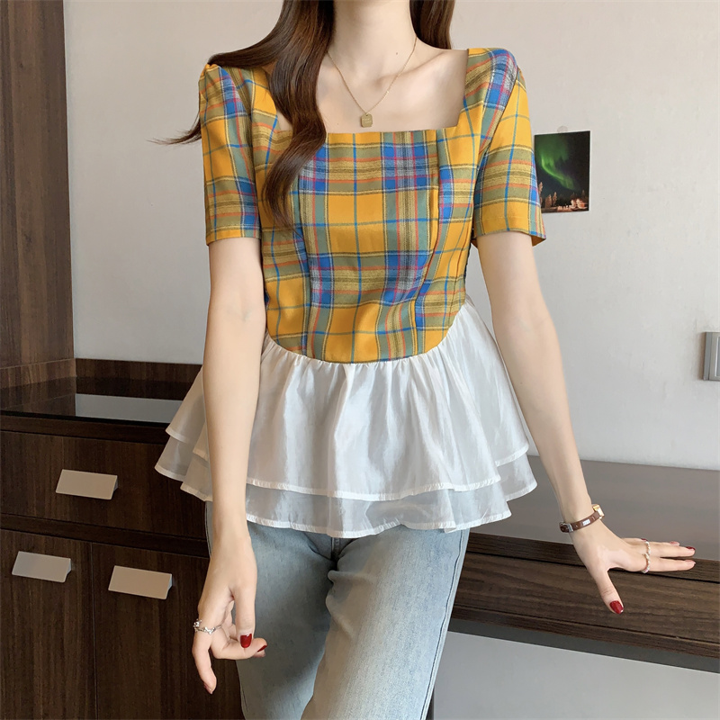 BY15526# 欧货方领花边拼接格子衬衫女夏新款超仙轻奢洋气短袖T恤上衣 服裝批發女裝批發服飾貨源