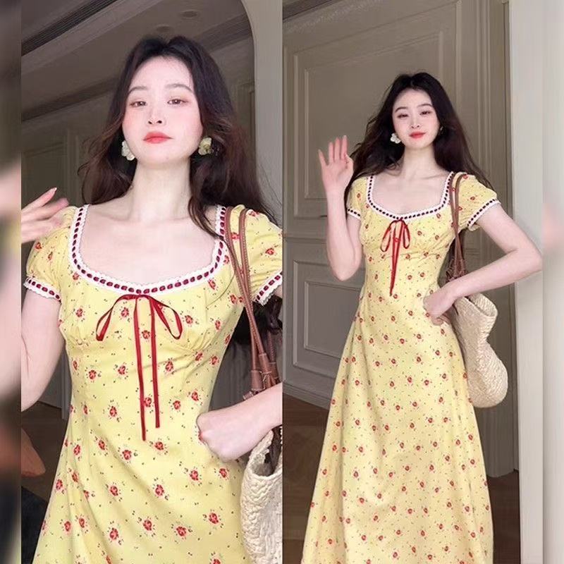 BY15531# 大码女装温柔风气质海边度假长裙法式方领黄色碎花连衣裙子女夏季 服裝批發女裝批發服飾貨源