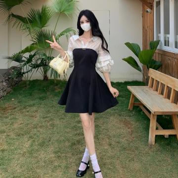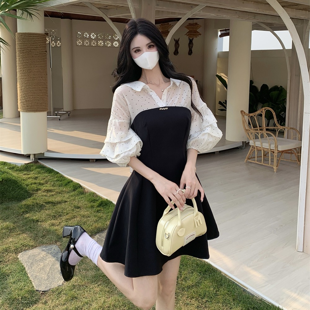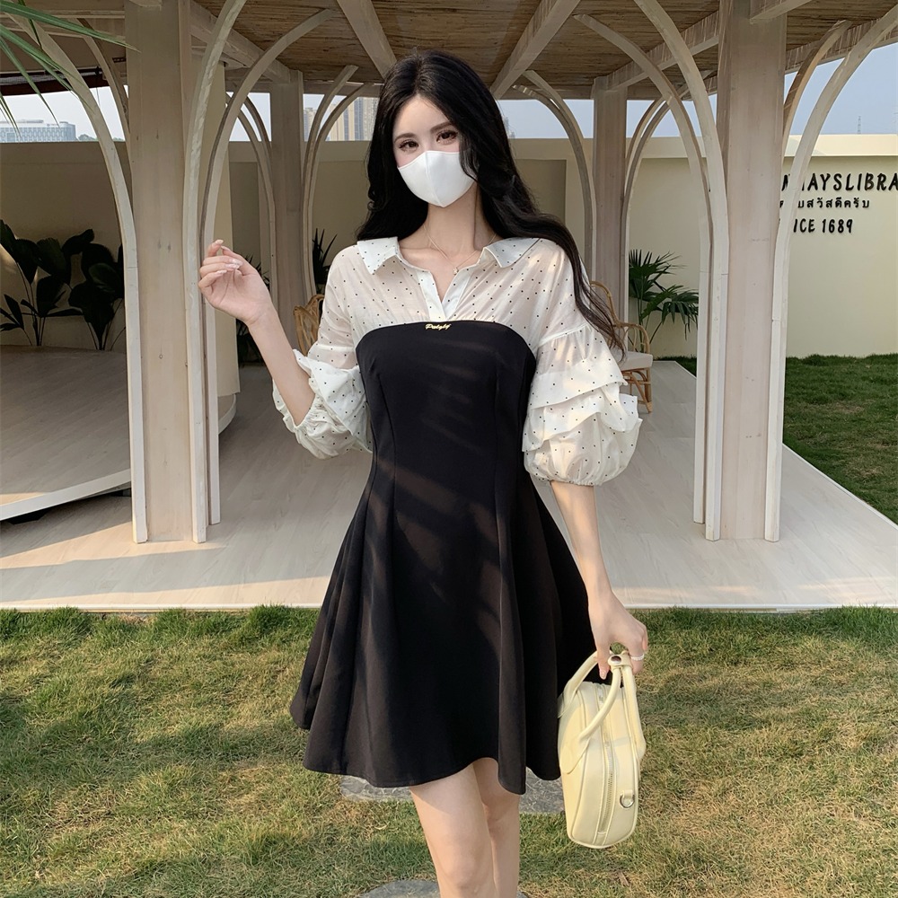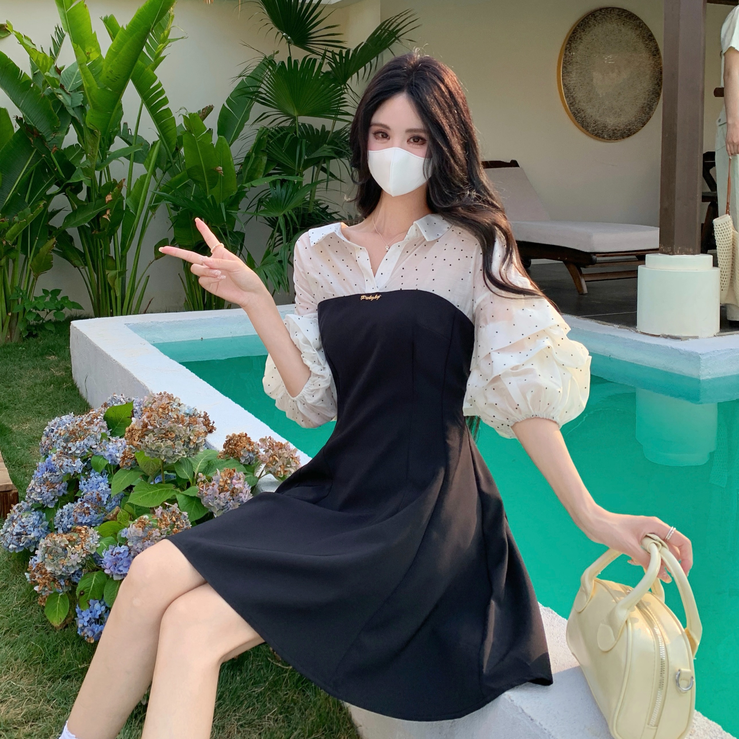 BY15532# 假两件法式波点衬衫大码连衣裙夏季新款设计感收腰显瘦A字裙 服裝批發女裝批發服飾貨源